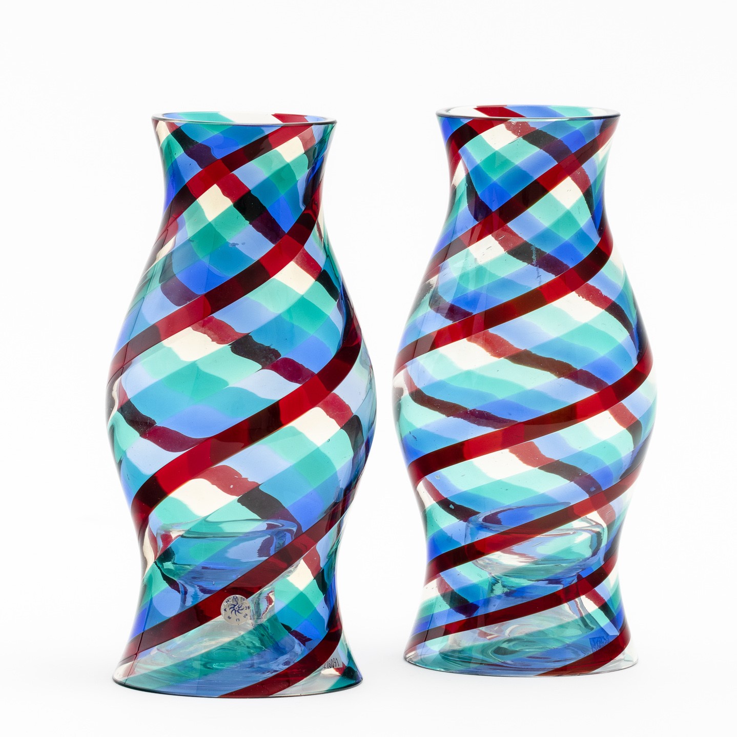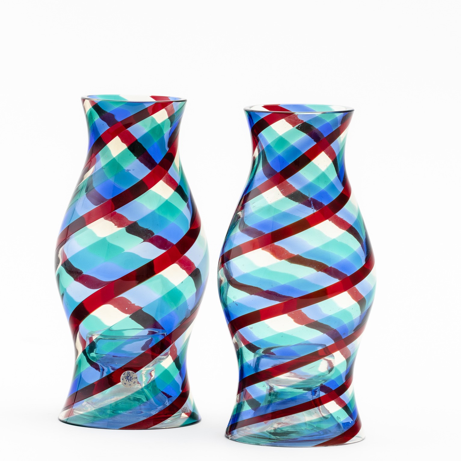 Coppia di lampade in vetro a fasce colorate. Reggicandela in vetro pesante trasparente.
