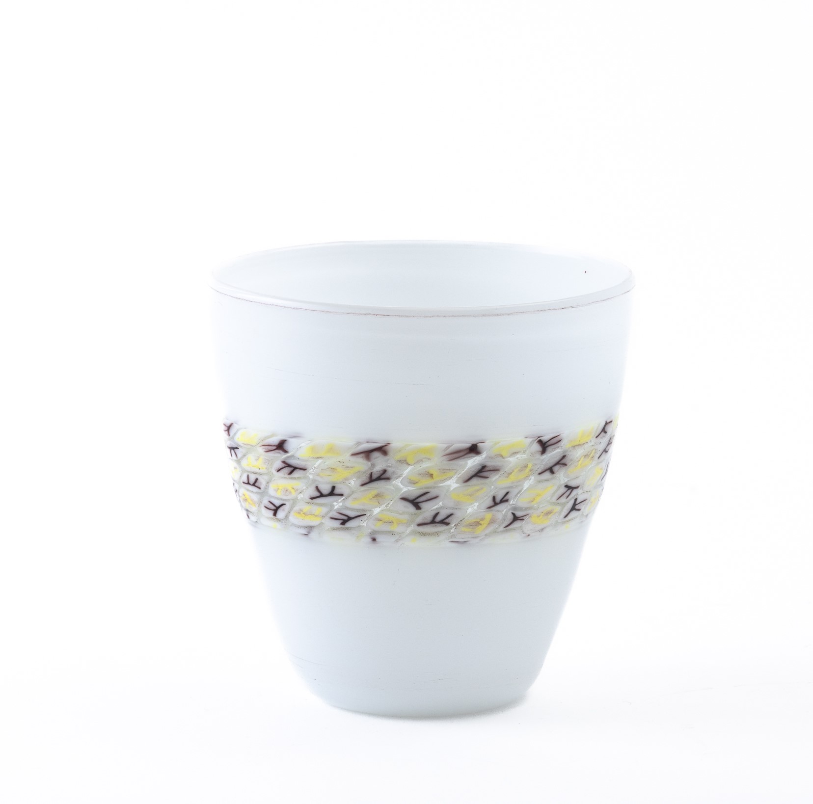 Vaso con doppio incalmo in vetro opalino con fascia a murrine a pettine.