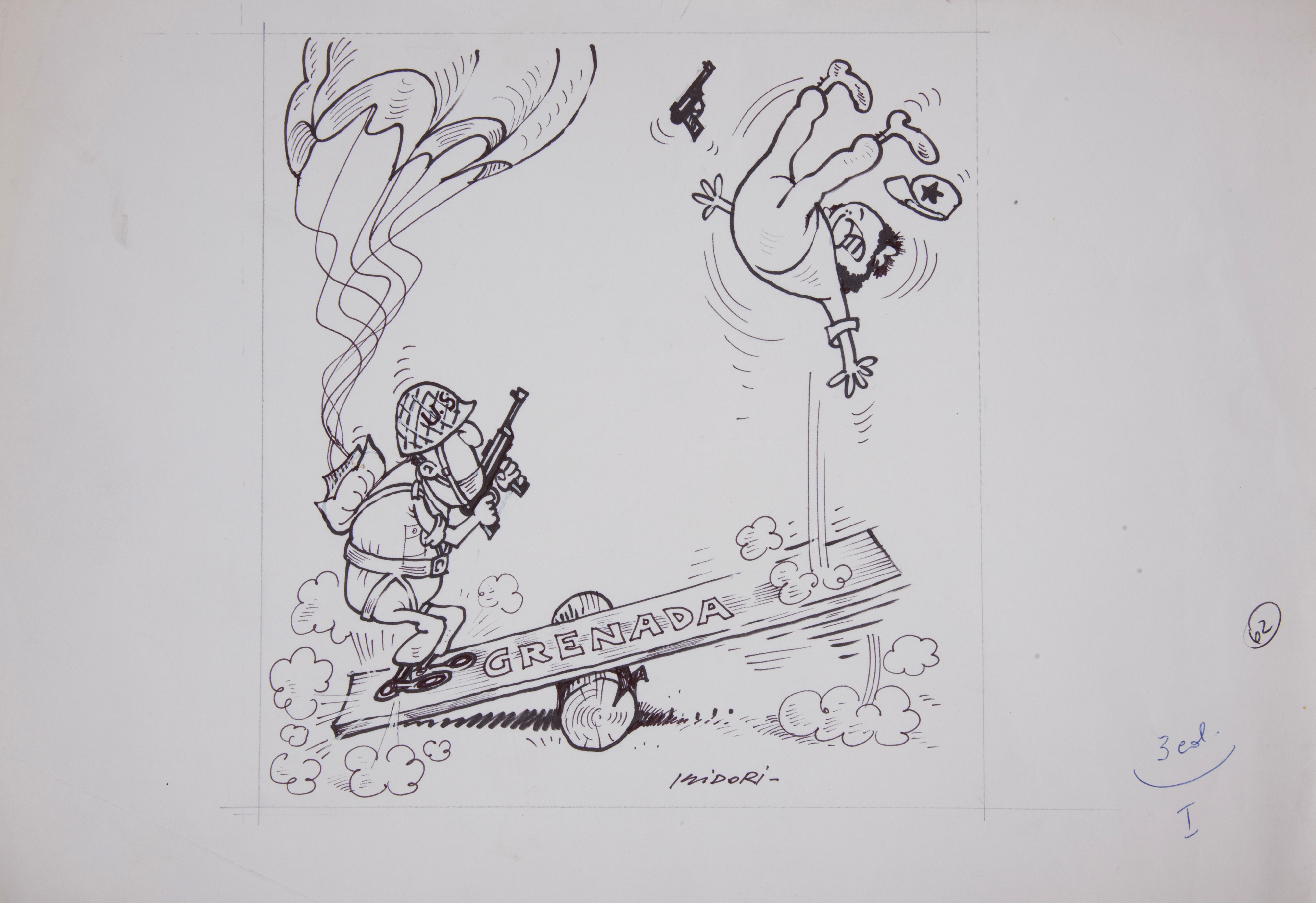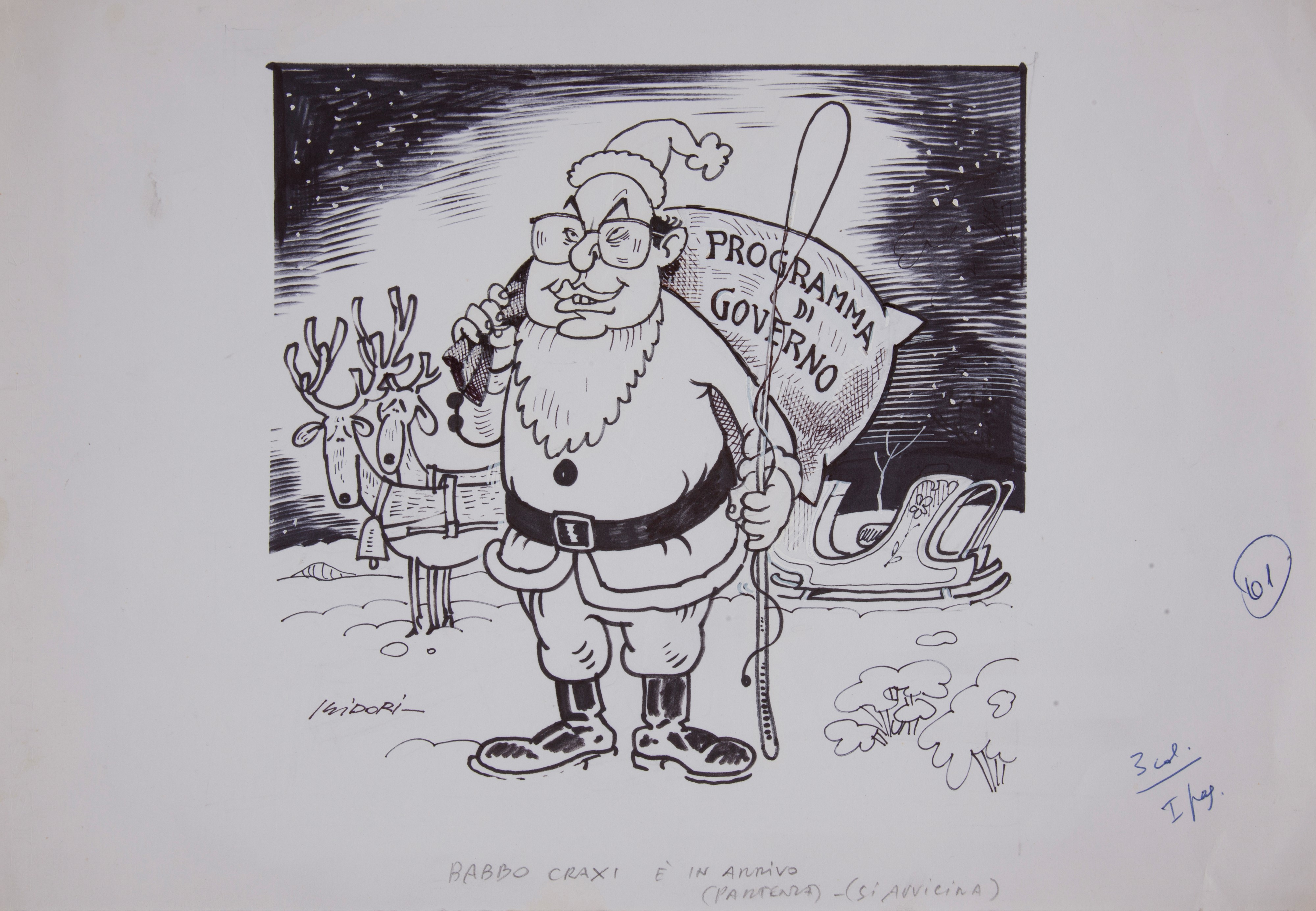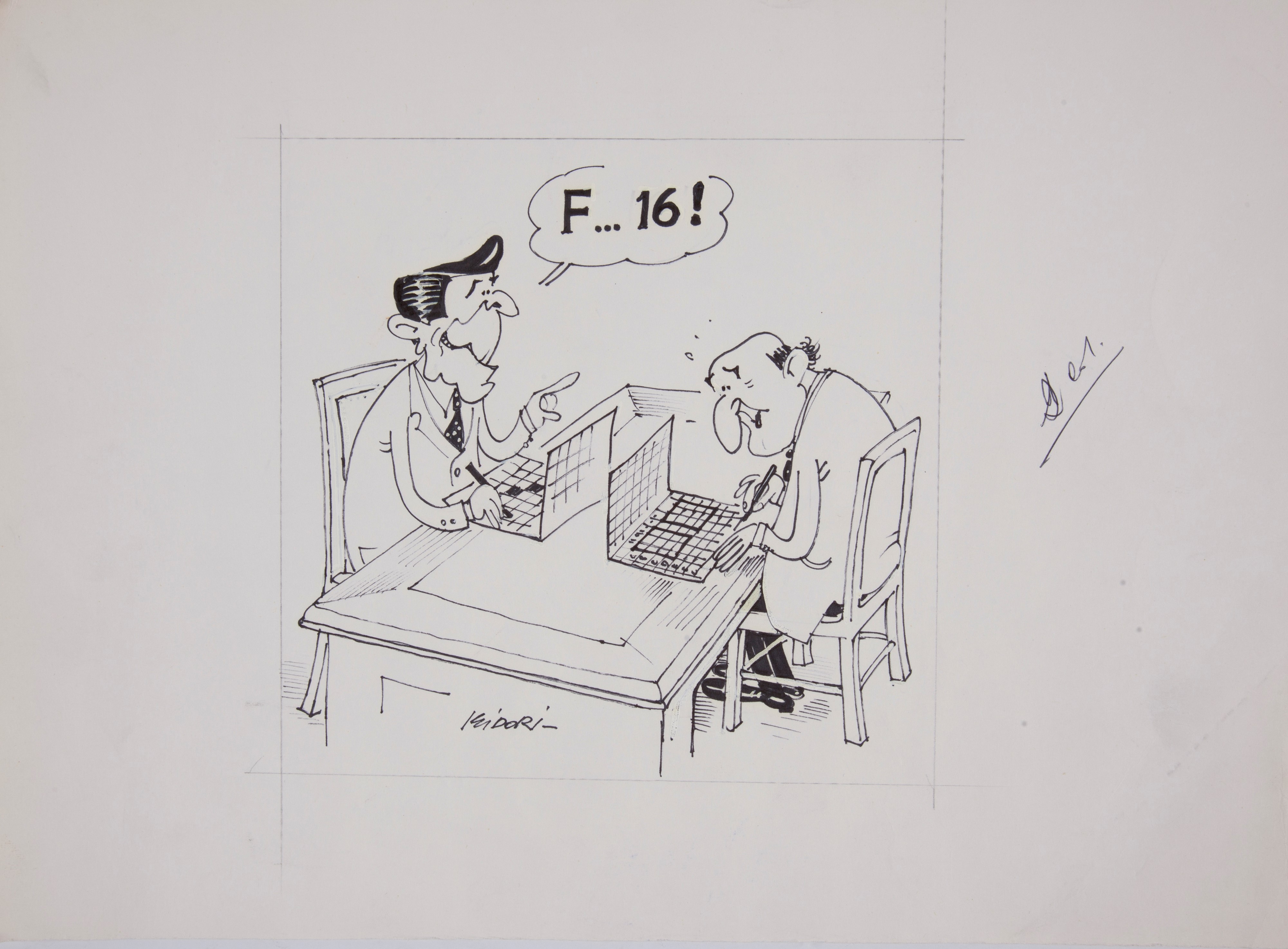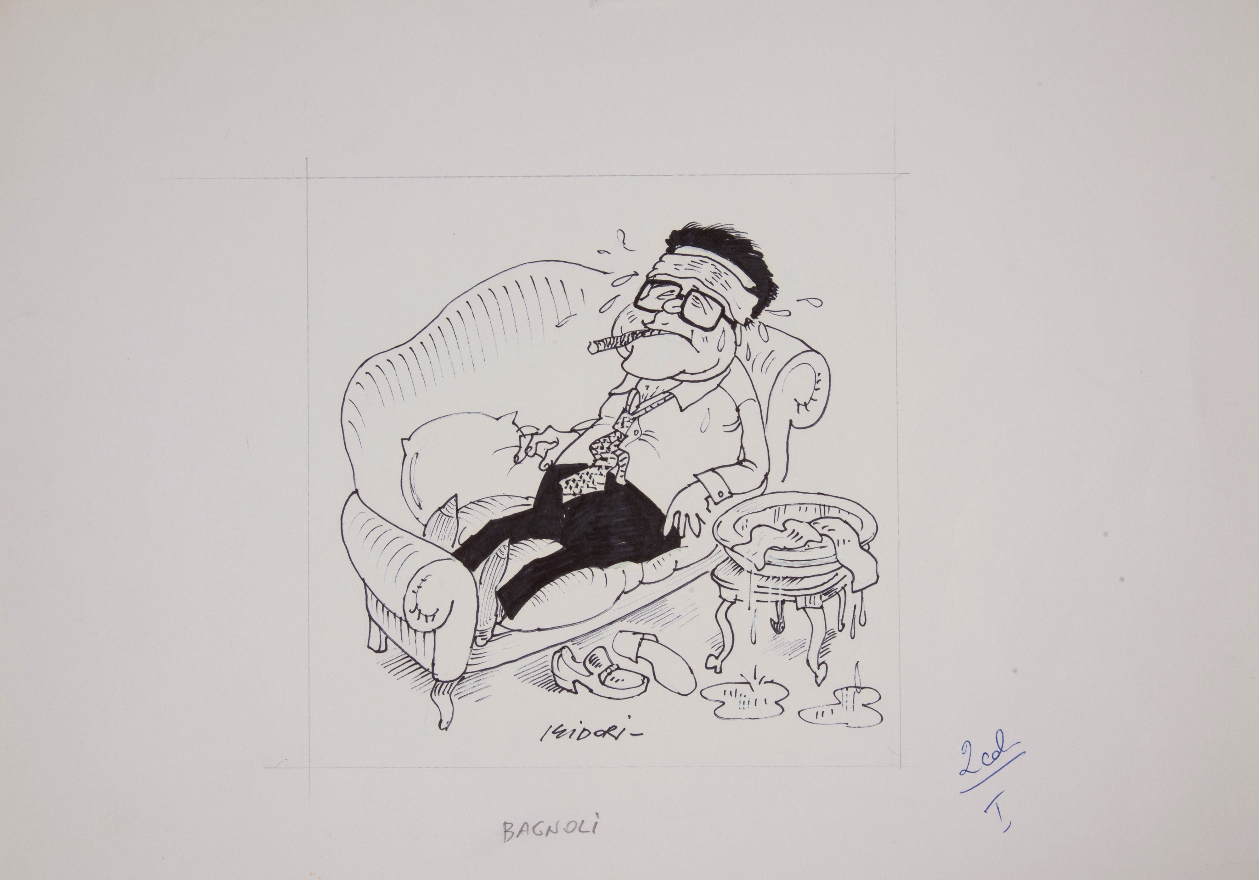 Cinque illustrazioni a carattere satirico, firmate Isidori, realizzate a china e pennarelli su carta, cm 25x36 l'una.