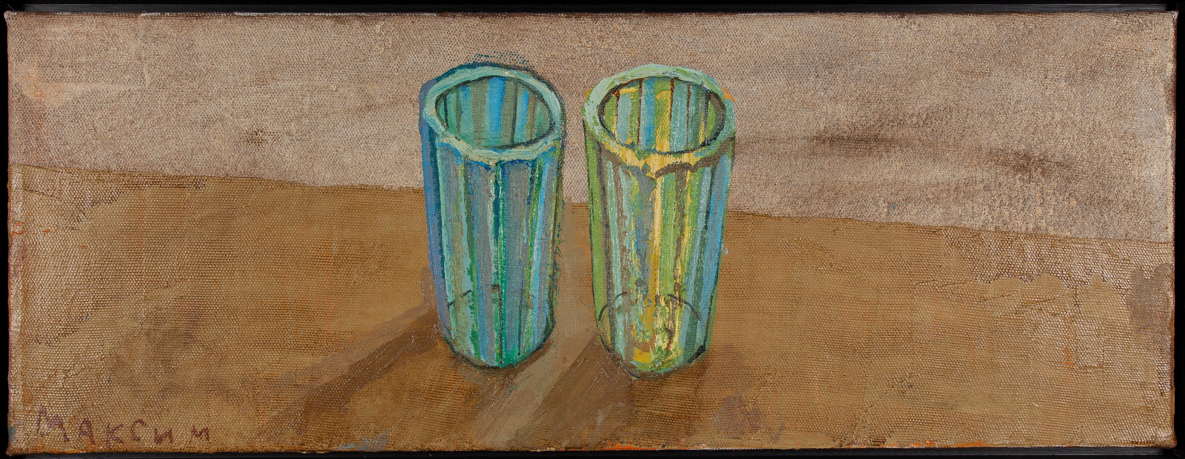 1999 Firma in basso a sinistra. Al verso reca titolo, firma e data Maxim Kantor 99, Two Glasses. Misure in cornice cm 32,5x79