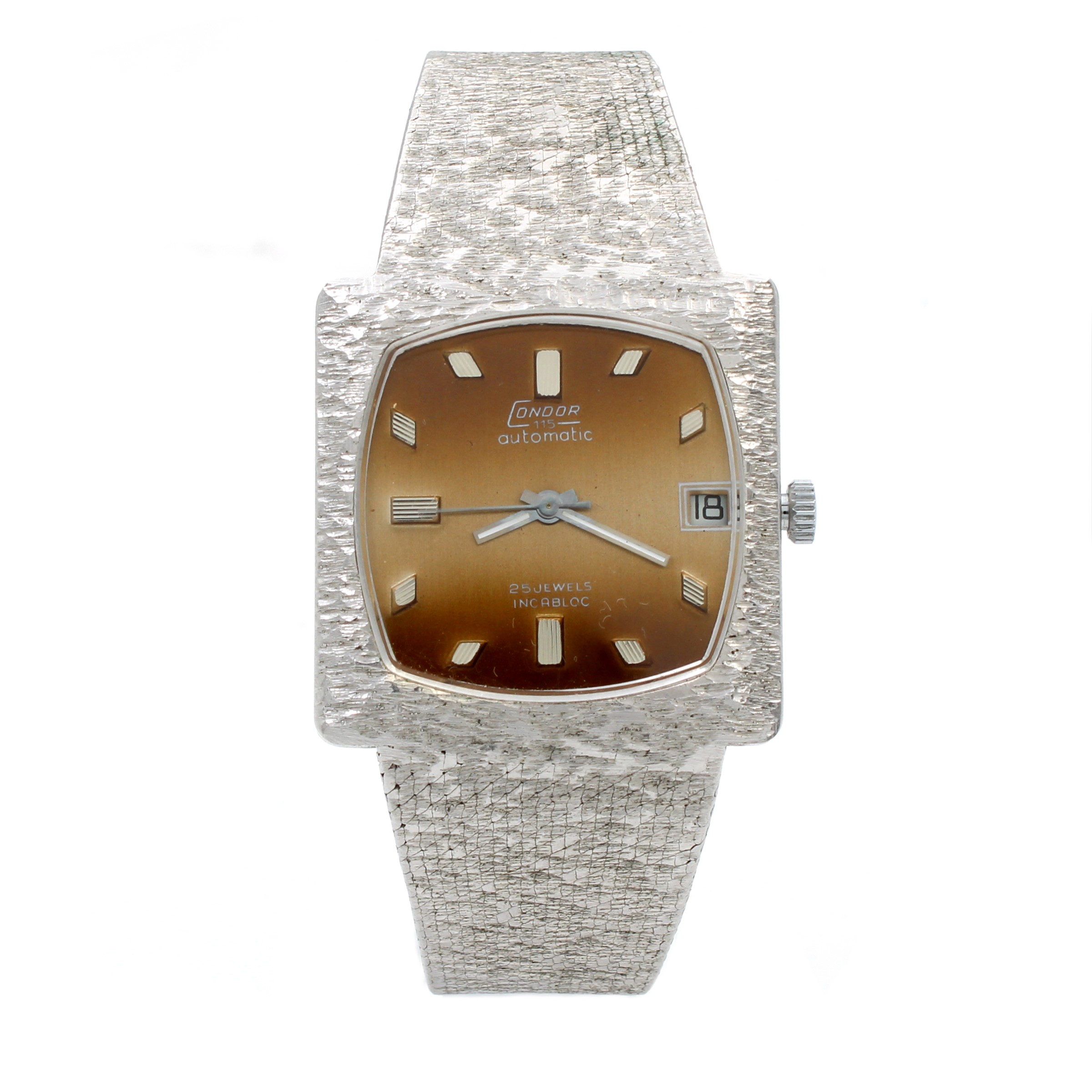 1970 circa in argento, cassa carré 32x32 mm. quadrante occhio di tigre con indici, datario ore 3, movimento meccanico a carica automatica, bracciale originale in argento con chiusura deployante