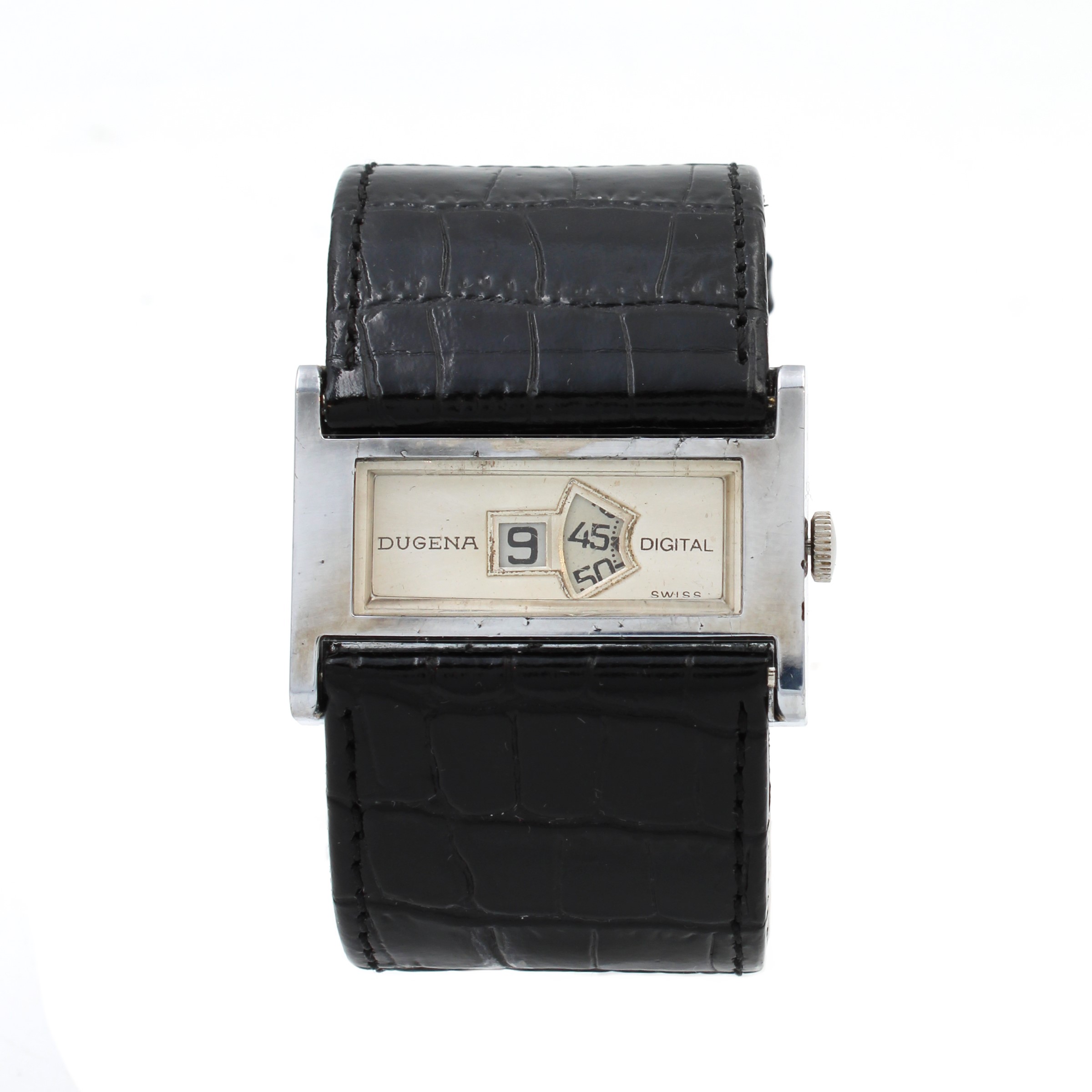 1970 circa in acciaio cromato, cassa di forma 40x28 mm. quadrante argentato con display digitale, due fessure per ore e minuti, movimento meccanico a carica manuale, cinturino in pelle con fibbia in metallo