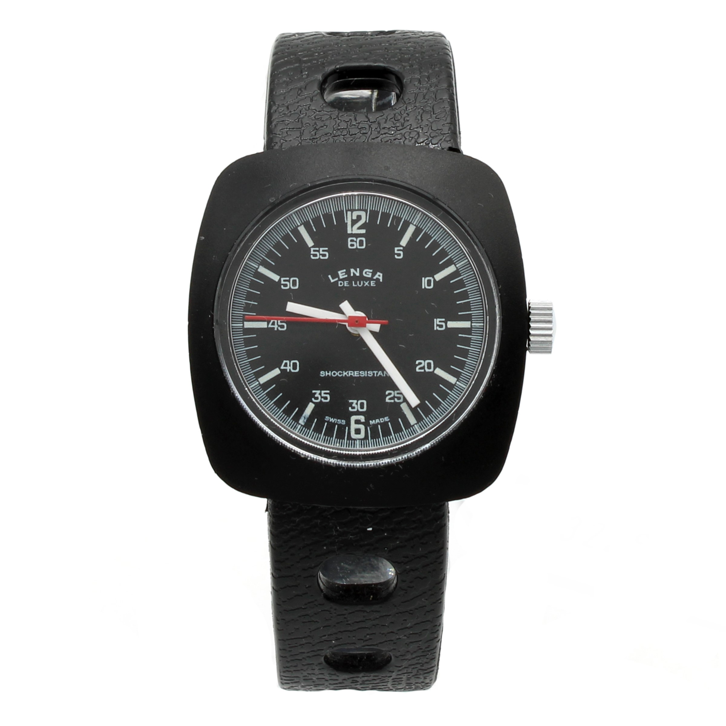1970 circa in bachelite nera, cassa di forma 33x35 mm. quadrante nero con indici e numeri arabi, contasecondi centro con lancetta rossa, movimento meccanico a carica manuale, cinturino plastica con fibbia