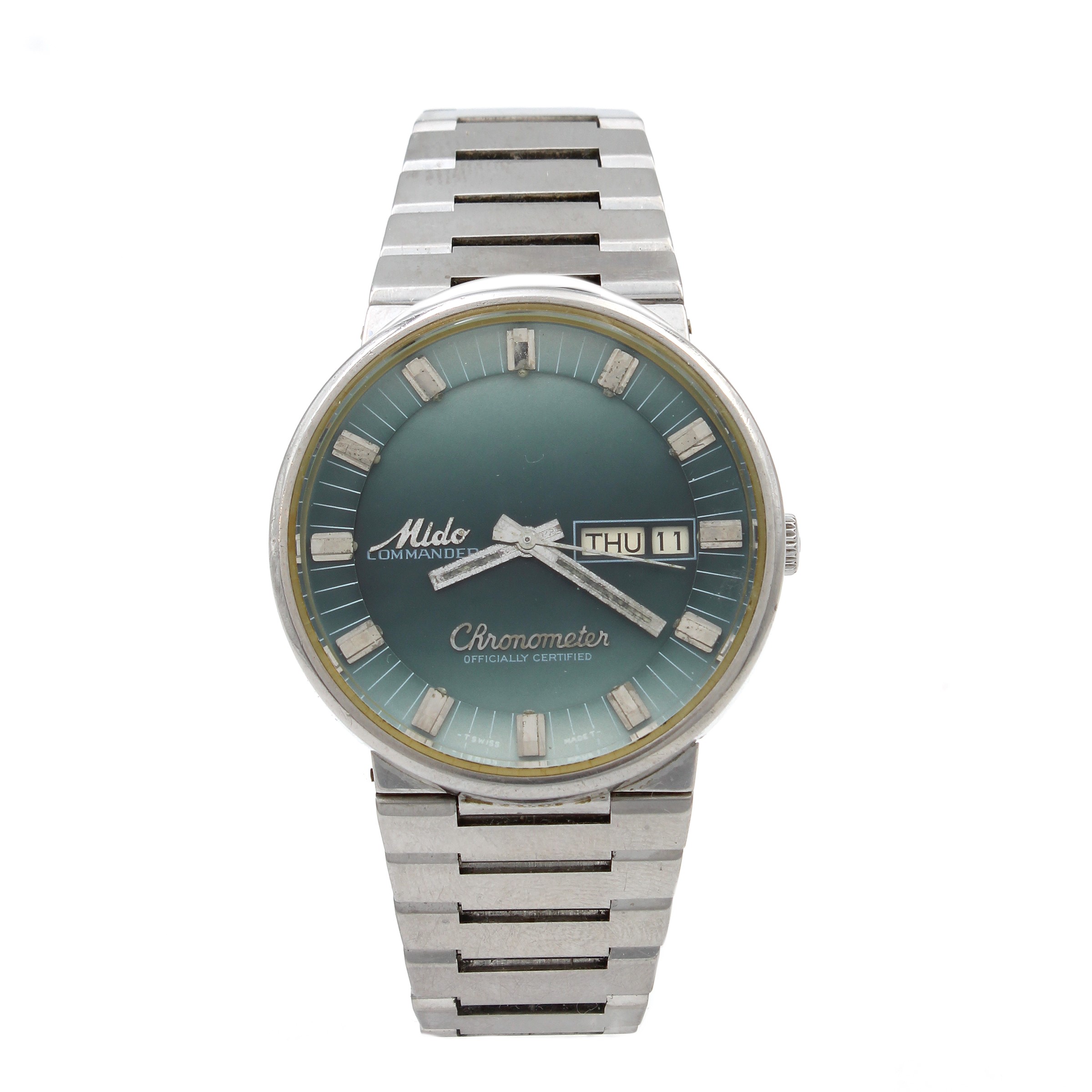 1970 circa in acciaio, cassa tonda 37 mm. quadrante verde duodial con indici, contasecondi centro, datario giorno e data ore 3, movimento meccanico a carica manuale, bracciale originale in acciaio