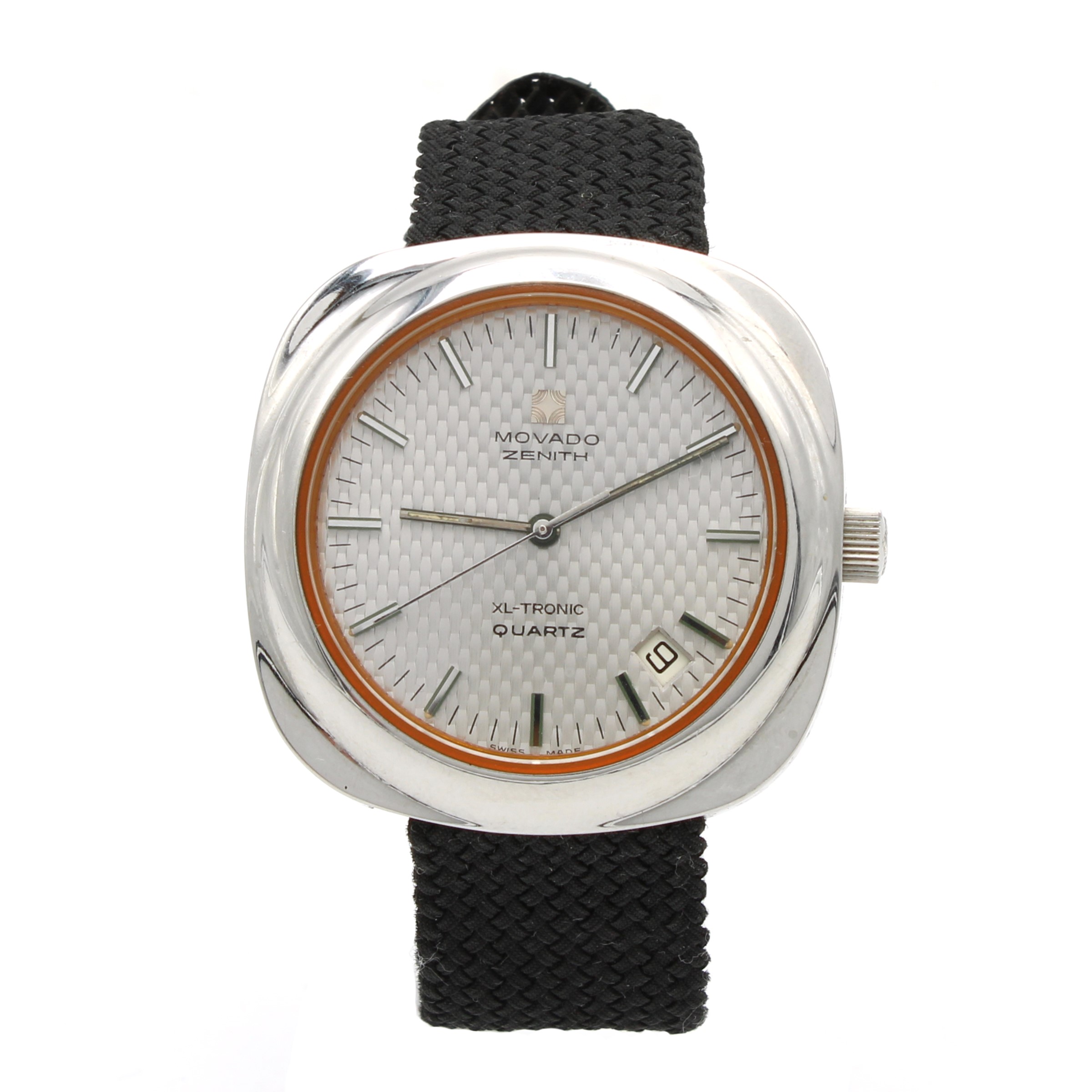 1970 circa in acciaio cromato, cassa di forma 40 mm. quadrante argentato datario tra le ore 4 e 5, movimento al quarzo, cinturino in corda con fibbia in metallo