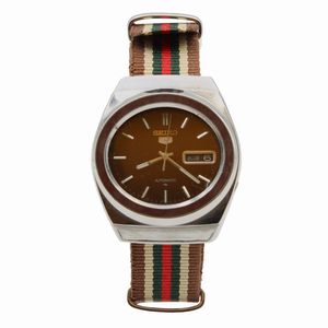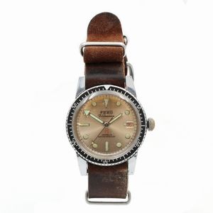 1969 circa in acciaio cromato, cassa di forma 38x42 mm. quadrante marrone con indici, datario ore 3, ghiera marrone, [..]