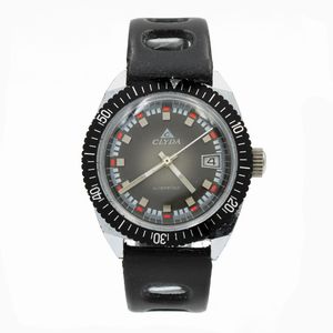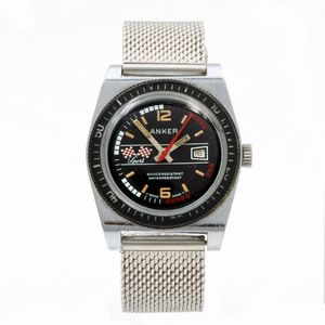 1969 circa in acciaio cromato, cassa di forma 36x37 mm. quadrante nero con indici e numeri arabi, datario ore [..]