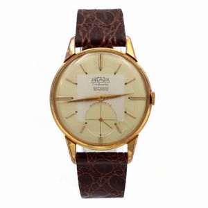 1959 circa in acciaio laminato oro, cassa tonda 34 mm. quadrante argentato con indici dorati, movimento meccanico [..]