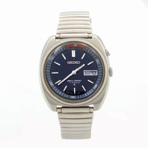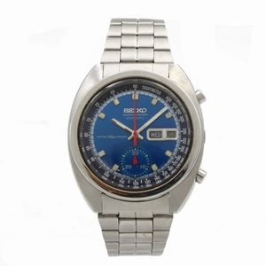 1970 circa in acciaio, cassa di tonda 39 mm. quadrante blu e bianco con indici e contasecondi centro, movimento [..]