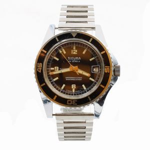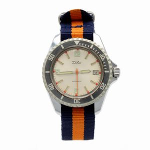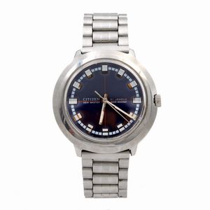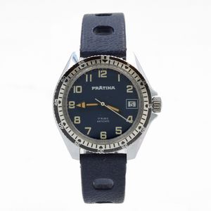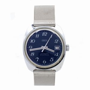 1970 circa in acciaio cromato, cassa 35mm. quadrante blu con numeri arabi, datario ore 3, movimento meccanico [..]