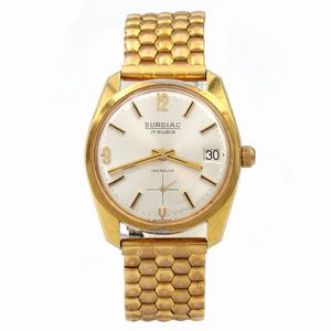 1969 circa in acciaio laminato oro, cassa tonda 34 mm. quadrante argentato con numeri arabi e indici dorati, [..]