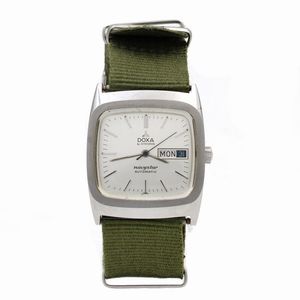 1970 circa in acciaio, cassa quadrata 33x36 mm. quadrante argentato con indici, datario giorno e data ore 3, [..]