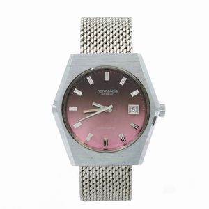 1970 circa in acciaio cromato, cassa esagonale 41x39 mm. quadrante rosa fumé con indici, datario ore 3, movimento [..]