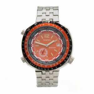 1970 circa in acciaio, cassa di forma 35x40 mm. quadrante duodial argentato e nero con indici, scala tachimetrica, [..]