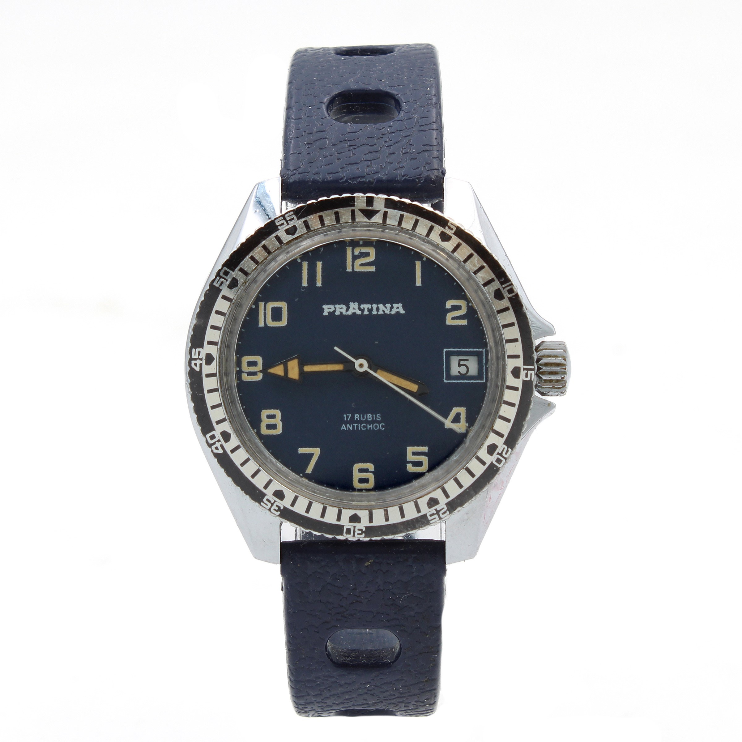 1970 circa in acciaio cromato, cassa tonda 35 mm. quadrante blu con numeri arabi, datario ore 3, ghiera girevole, movimento meccanico a carica manuale, bracciale in plastica con fibbia in metallo
