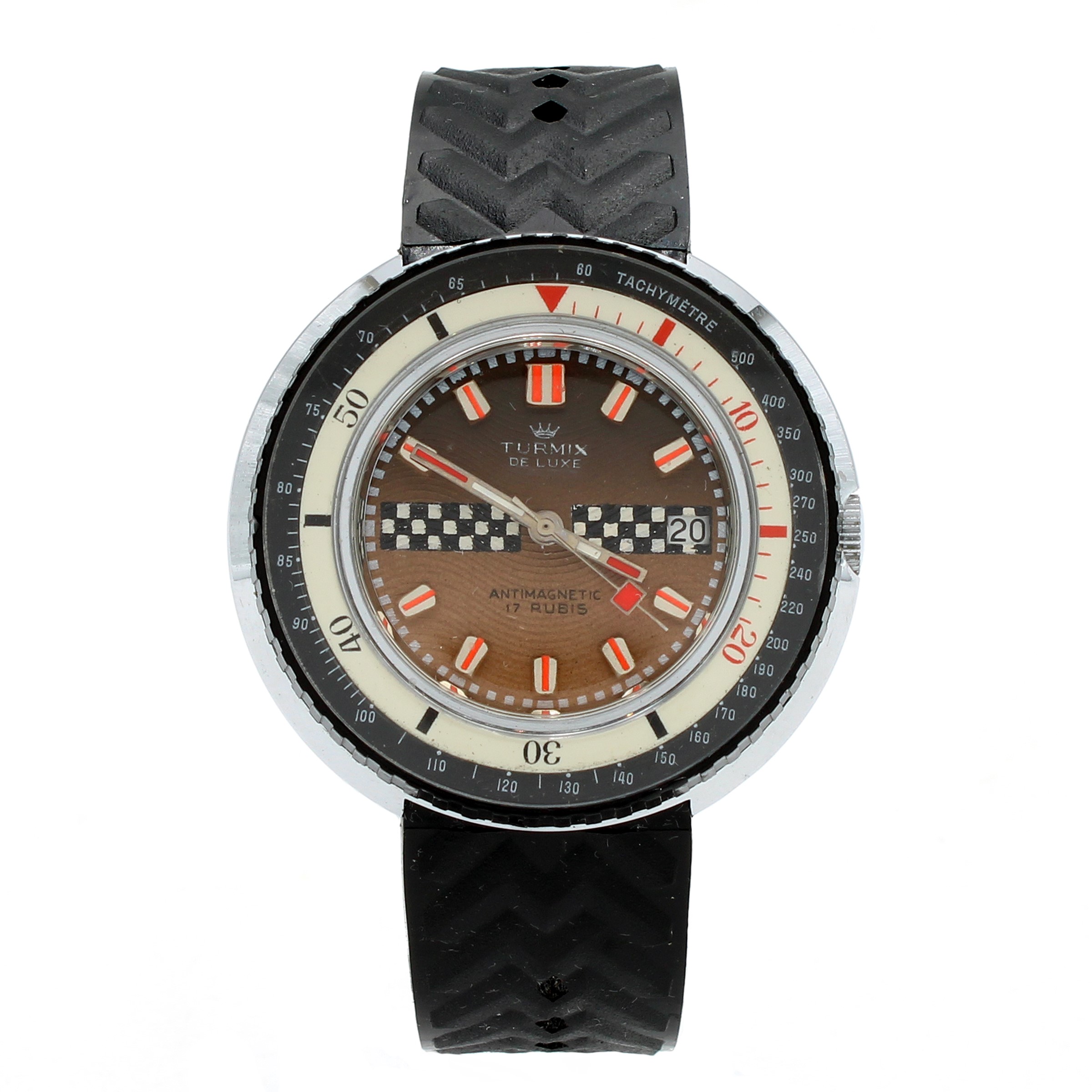 1969 circa in acciaio cromato, cassa tonda 43 mm. quadrante racing marrone con indici arancio, datario ore 3, ghiera girevole con scala tachimetrica, movimento meccanico a carica manuale, cinturino in gomma con fibbia in metallo