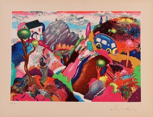 Litografia a colori, es. 64/100, cm. 15,5x22,5 (lastra), cm. 27,8x34,3 (carta) 1971 Firma e data a matita sul [..]