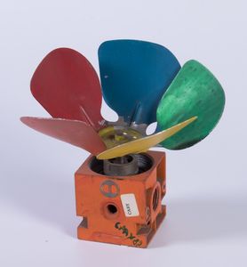 Scultura in metallo dipinto, cm. 15 h. 1989 Firma e data su un lato: Cary 89.
