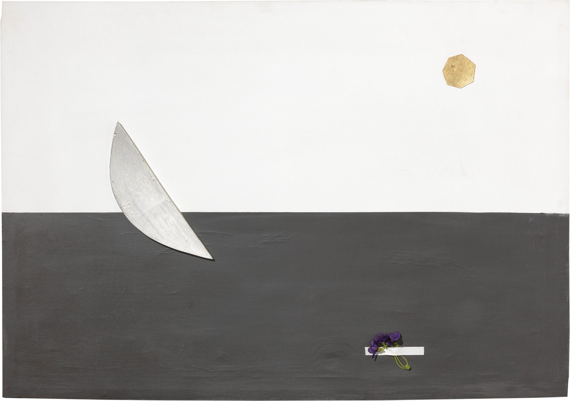 Acrilico e assemblaggio su tela, cm. 71x100,5
