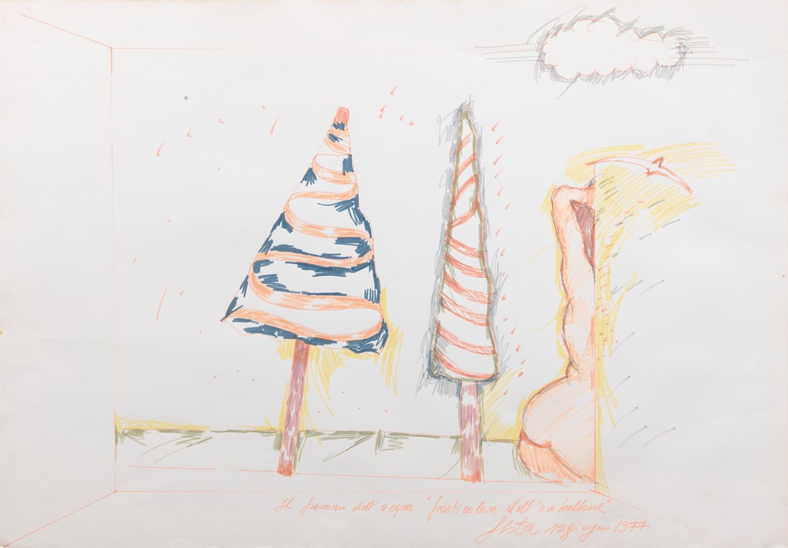 Pennarelli su carta, cm. 70x100 1977 Titolo, firma e data in basso al centro: Il percorso dell'acqua: particolare dell'ombrellone / Festa 12 giugno 1977. Al verso, su un cartone di supporto: timbro Galleria Margutta n. 9.