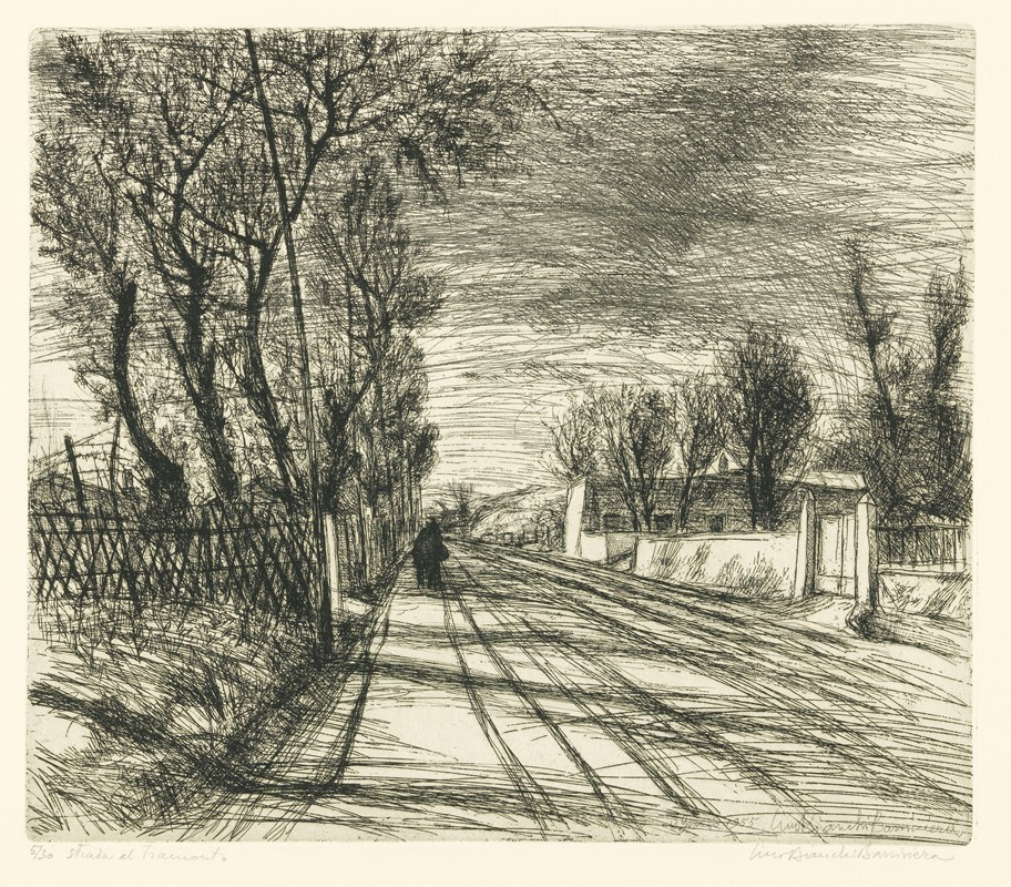 Acquaforte, es. 5/30, cm. 39,5x46 (lastra), cm. 47,5x55,2 (carta) 1955 Data e firma in lastra in basso a destra: 13 Gennaio 1955 Lino Bianchi Barriviera; firma a matita sul margine in basso a destra: Lino Bianchi Barriviera, tiratura e titolo in basso a sinistra: 5/30 Strada al tramonto.