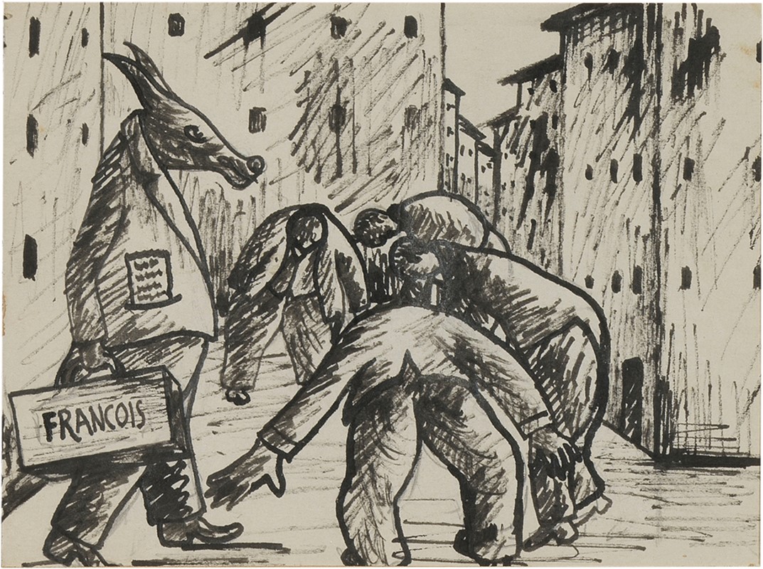 1929-30 A) Per una lettera fascista. Basta con le traduzioni!, inchiostro e matita su carta, cm. 15,3x20,3. Scritta al verso: Bargello / cm 7;