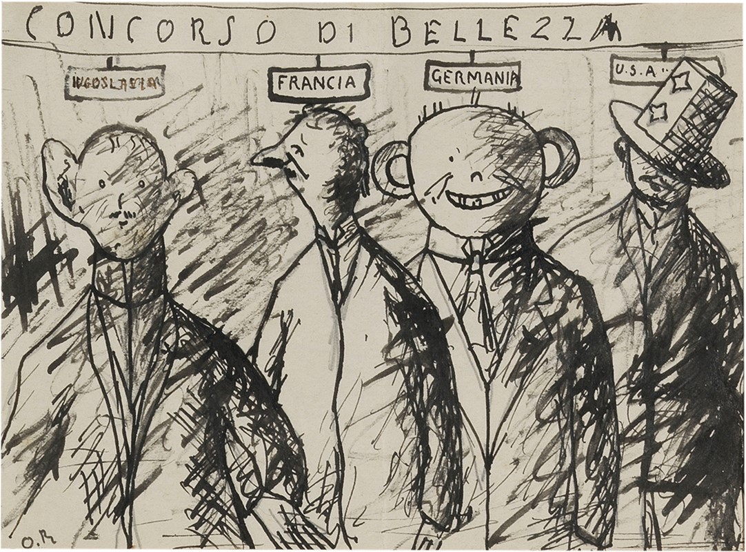 C) Concorso di bellezza, inchiostro e matita su carta, cm. 15,3x20,7. Sigla in basso a sinistra: O.R.; titolo e scritta al verso: Concorso / di bellezza / Bargello / cm 7.