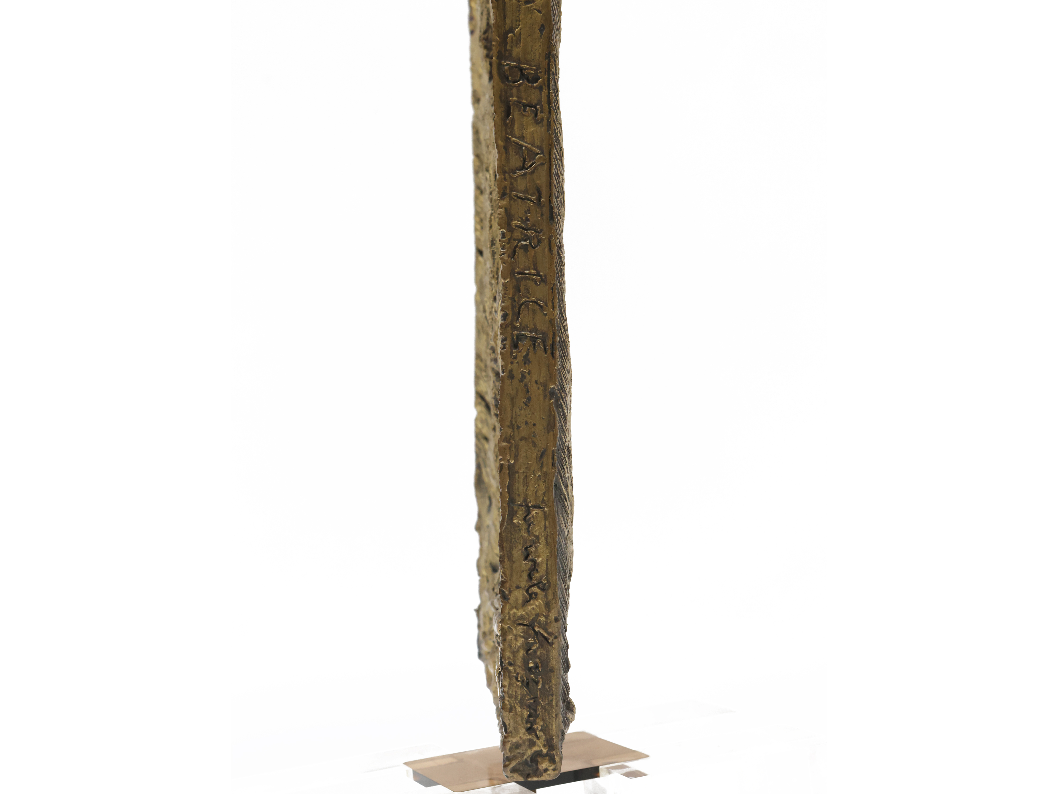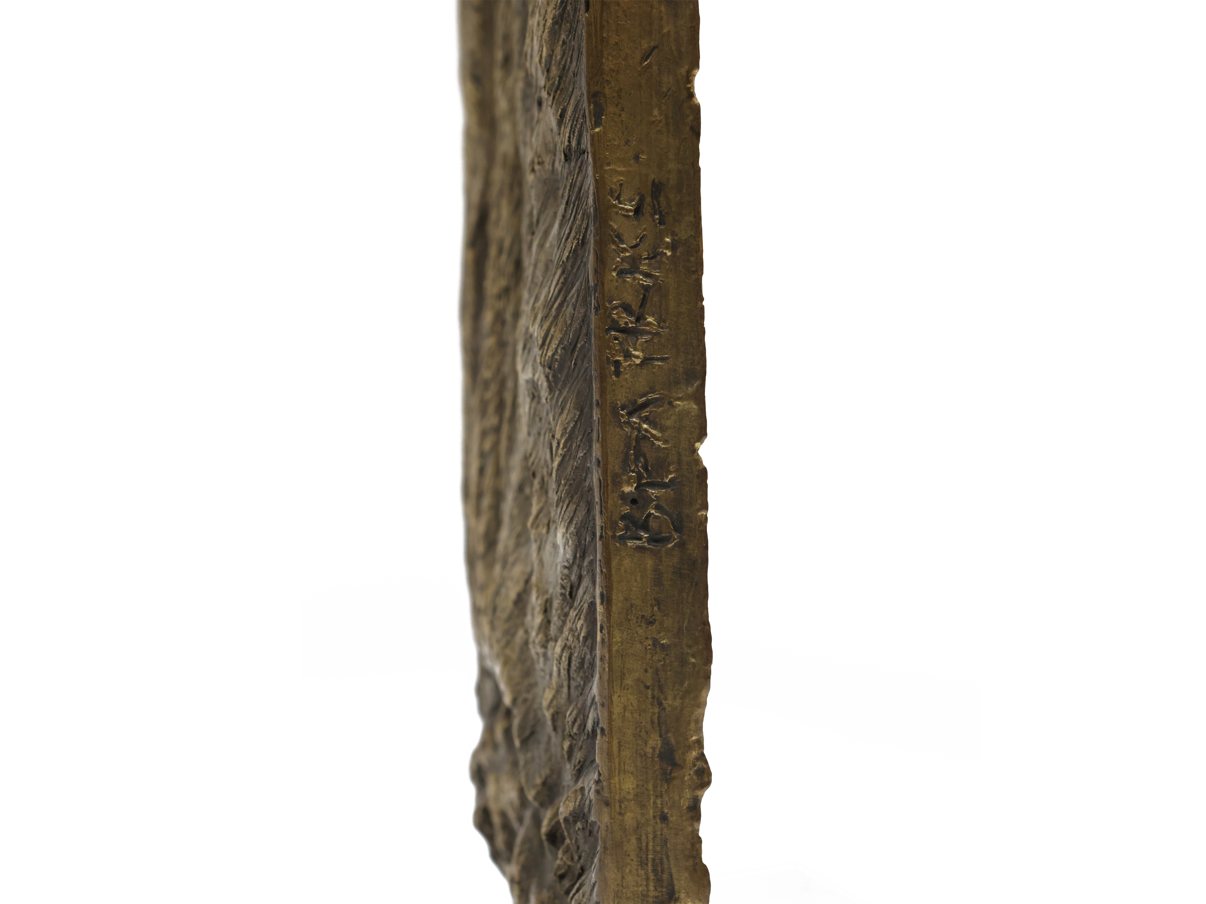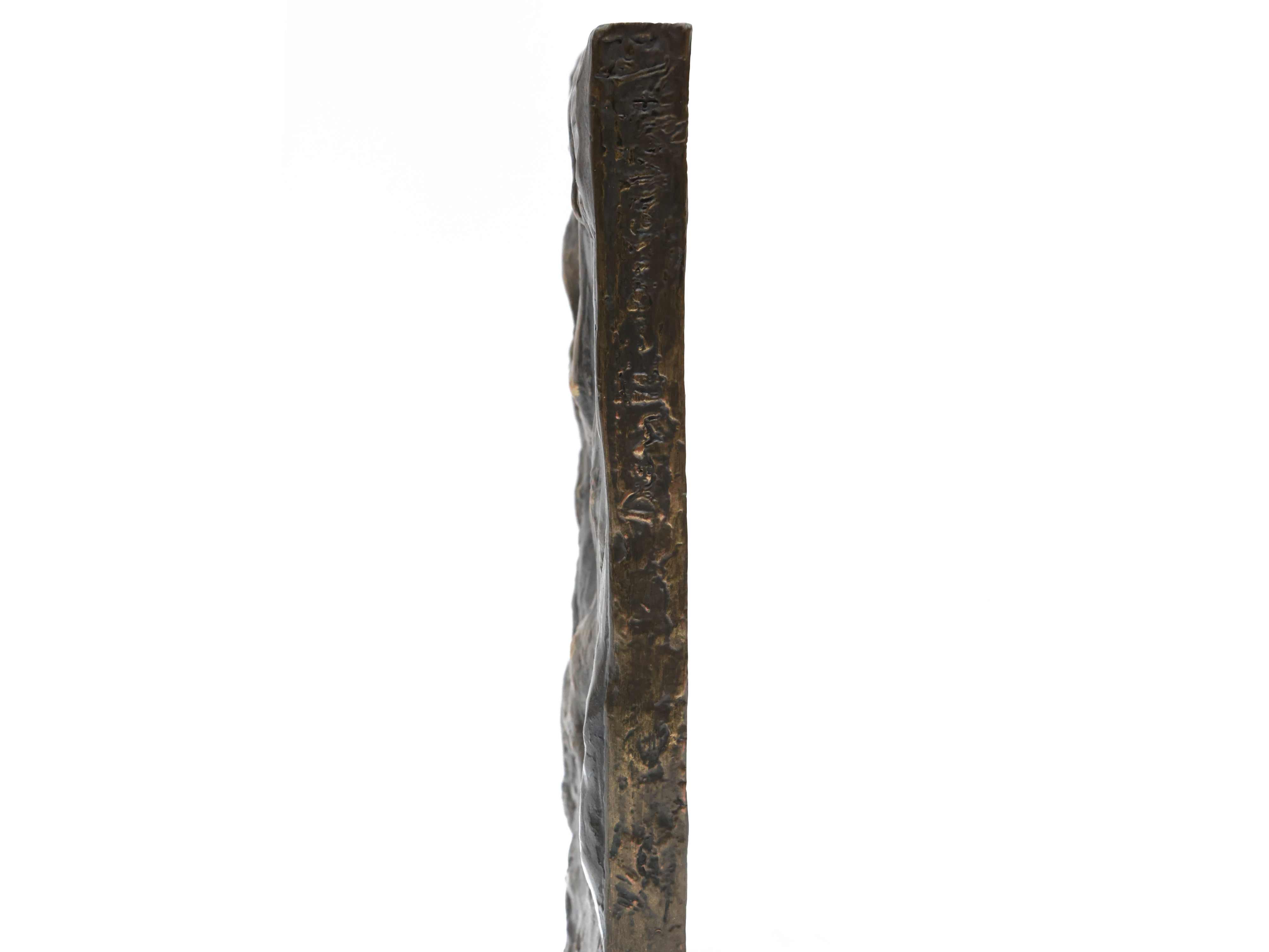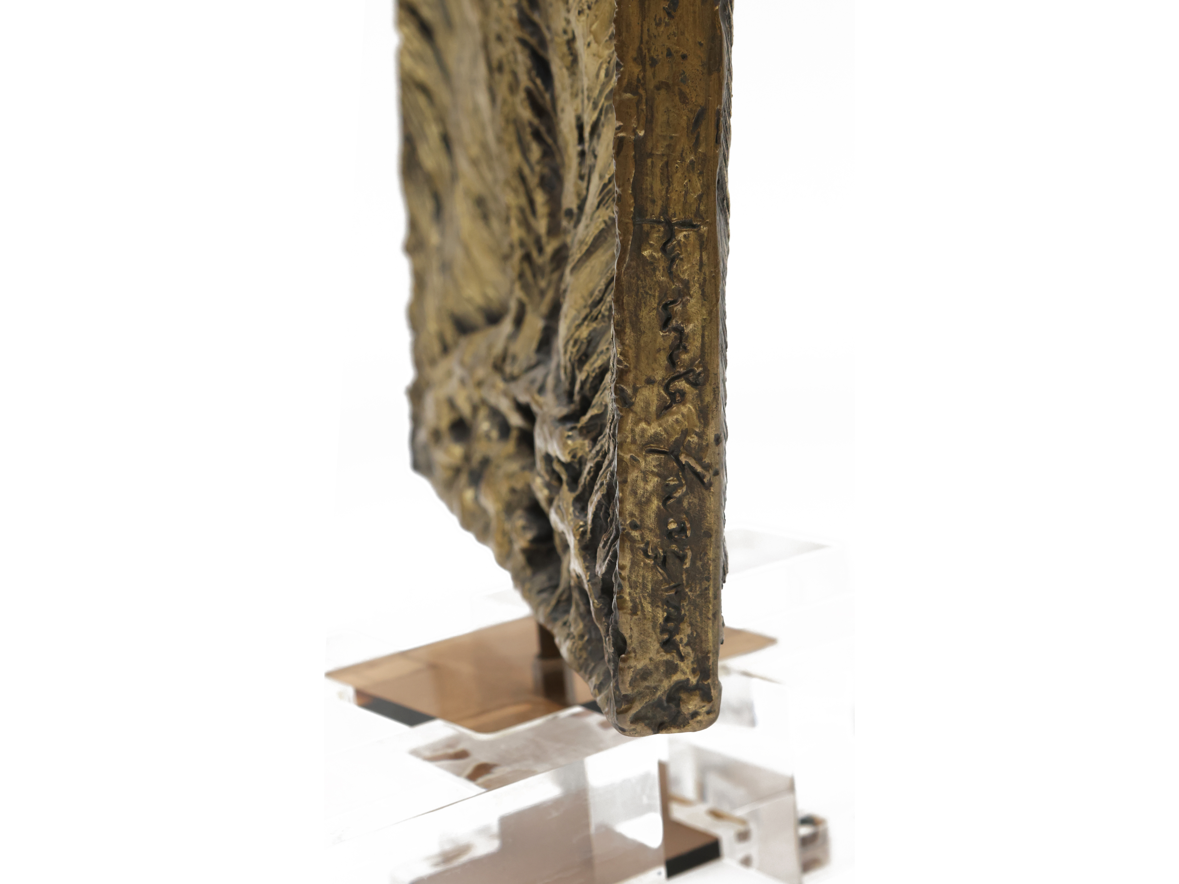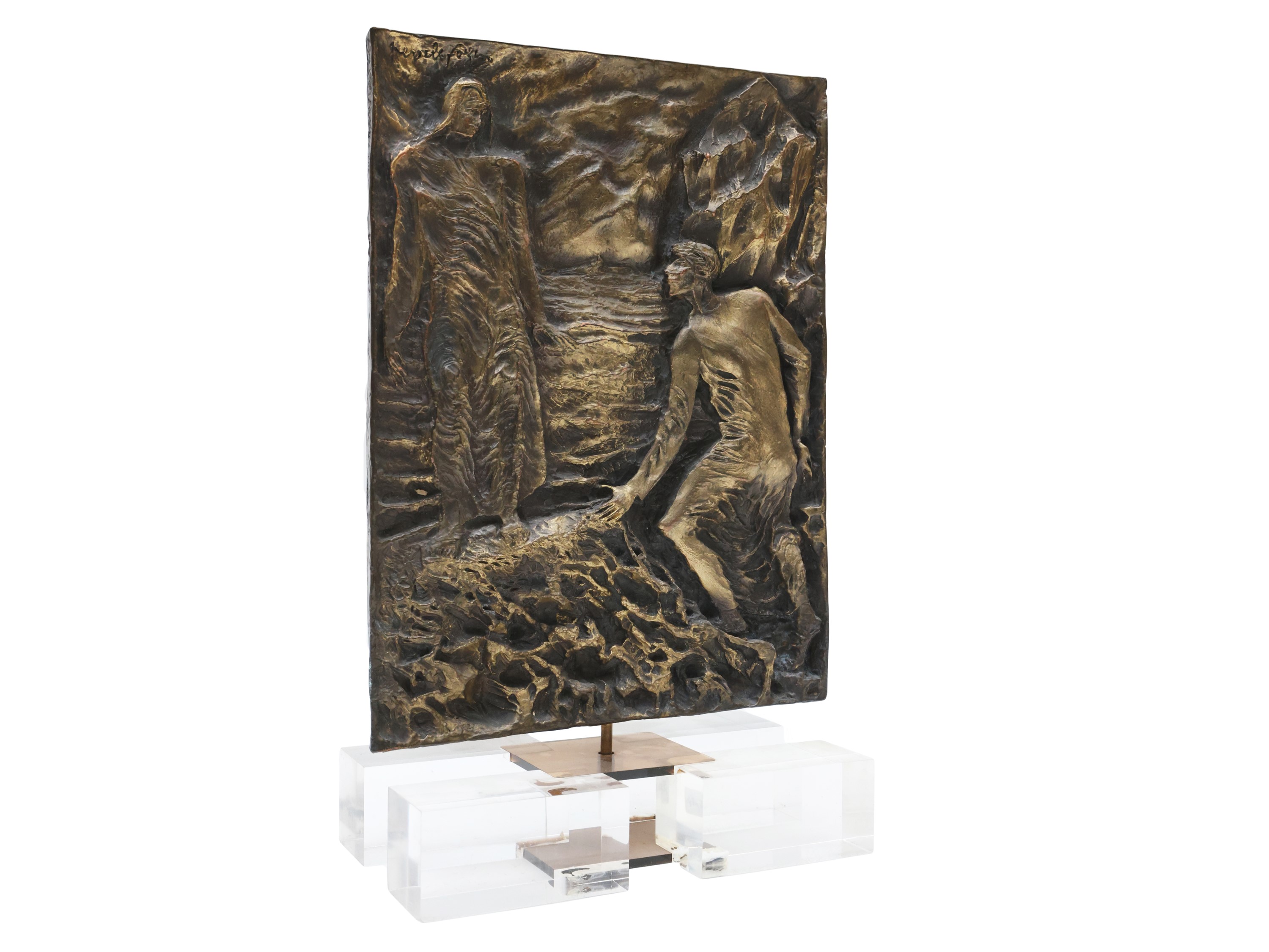 due bassorilievi in bronzo, firmati, es 503/950 e es 29/950, su base in plexiglass