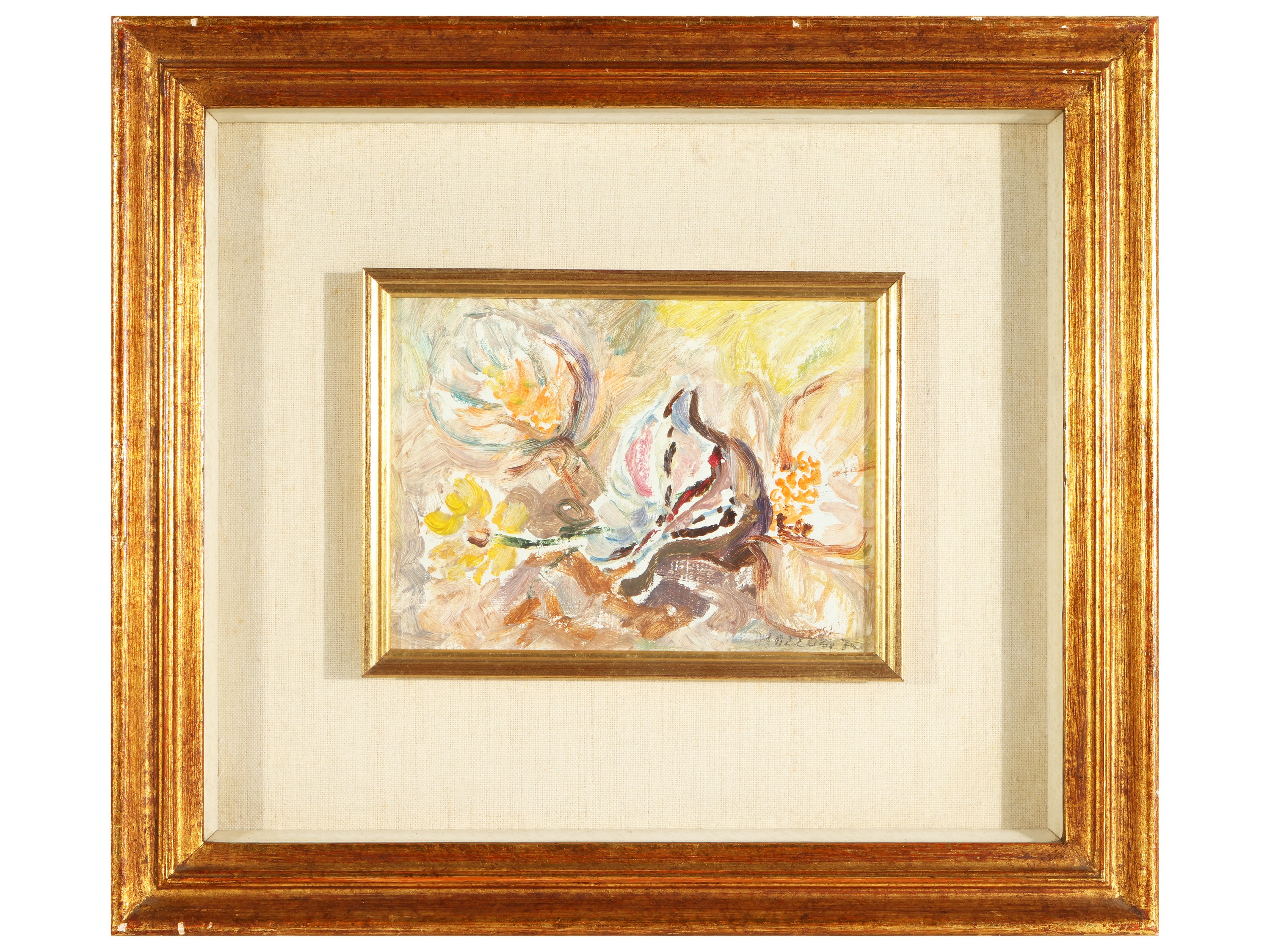 raccolta di dipinti tra cui una natura morta di Franco Mazzoni, una composizione di Seve Sospizio ed un altra di Lorenzo D'Andrea, firmati in cornice