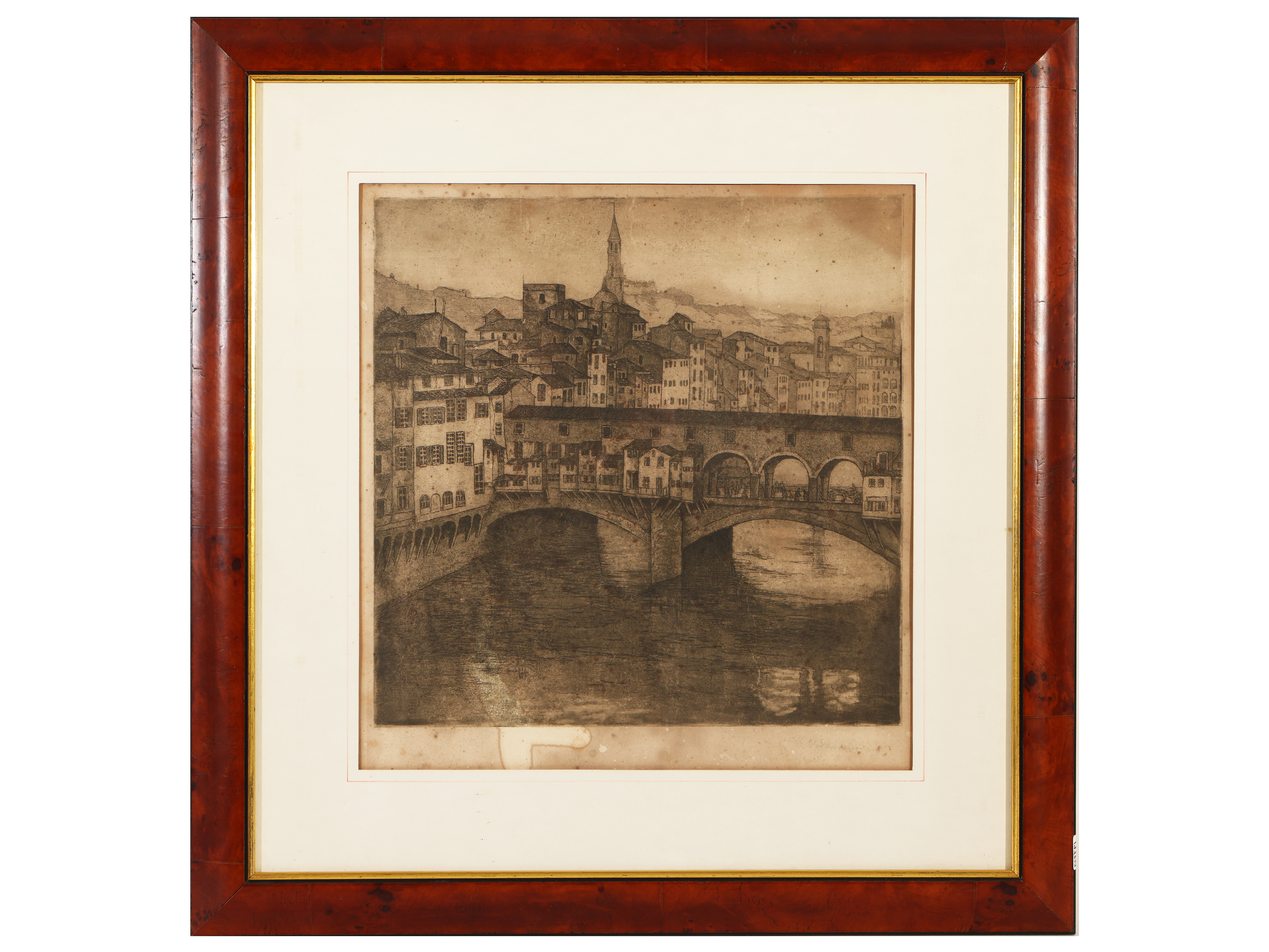 da cm 34x48 a cm 69x49 (6) raccolta di incisioni e litografie tra cui una tecnica mista di Enzo Faraoni, due incisioni di Renato Alessandrini, una litografia di Rodolfo Marma, un'acquaforte raffigurante Ponte Vecchio, in cornice alcuni difetti