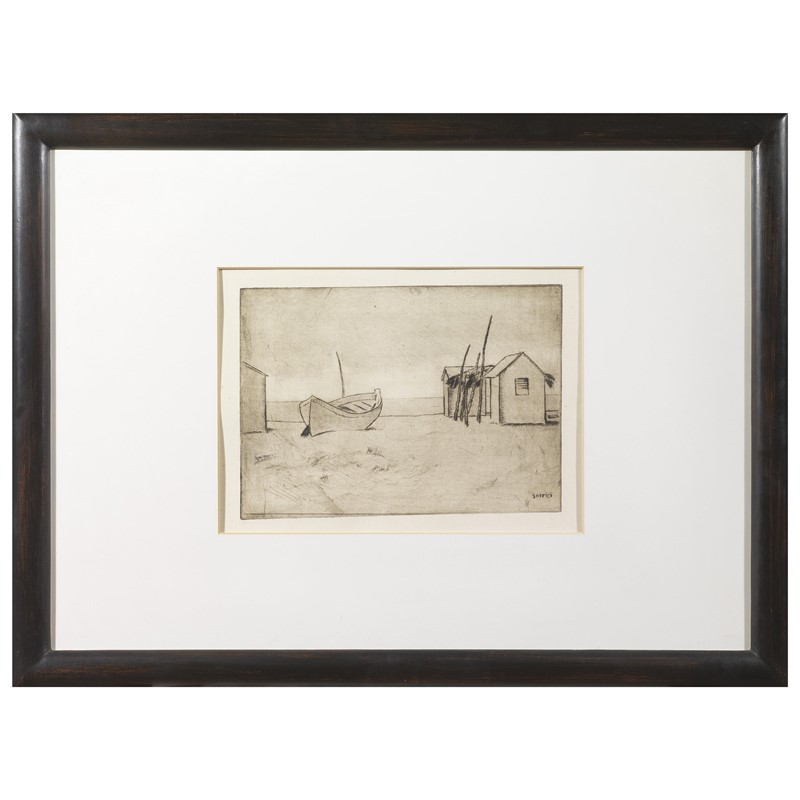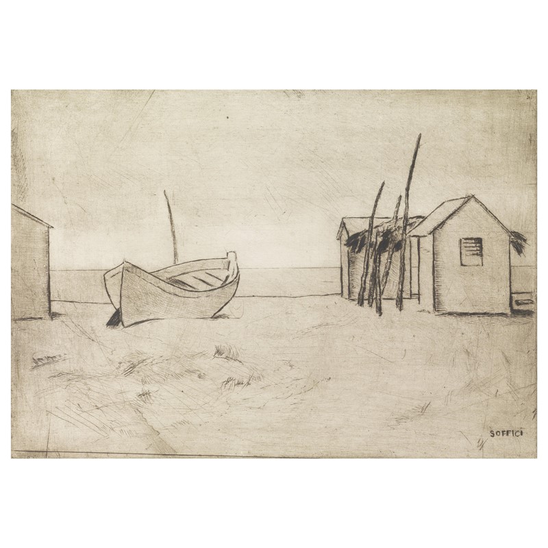 ARDENGO SOFFICI (Firenze 1879 - Forte dei Marmi 1964) Barche e capanno 1927-1928 puntasecca cm 14,5x21 su foglio cm 33,5x39,5 firmato a matita in basso a destra firmato a lastra tirata a pochissimi esemplari non numerati e non tutti firmati Edizione Libreria Prandi, Reggio Emilia