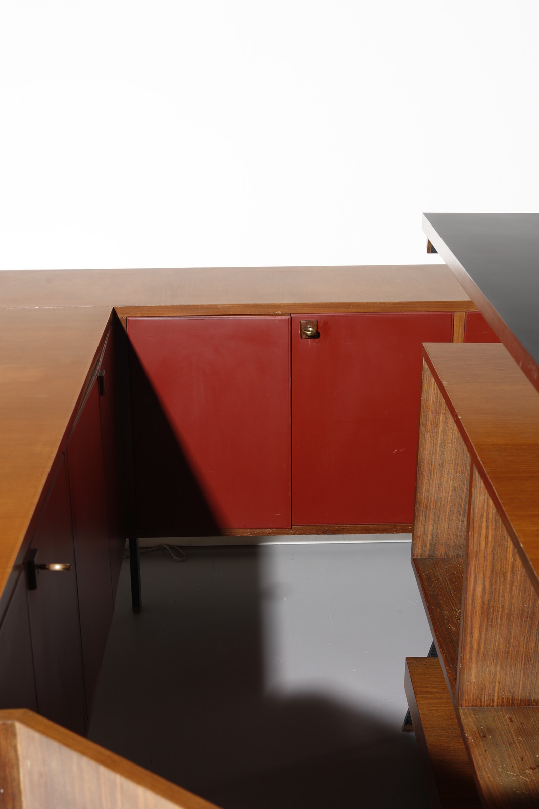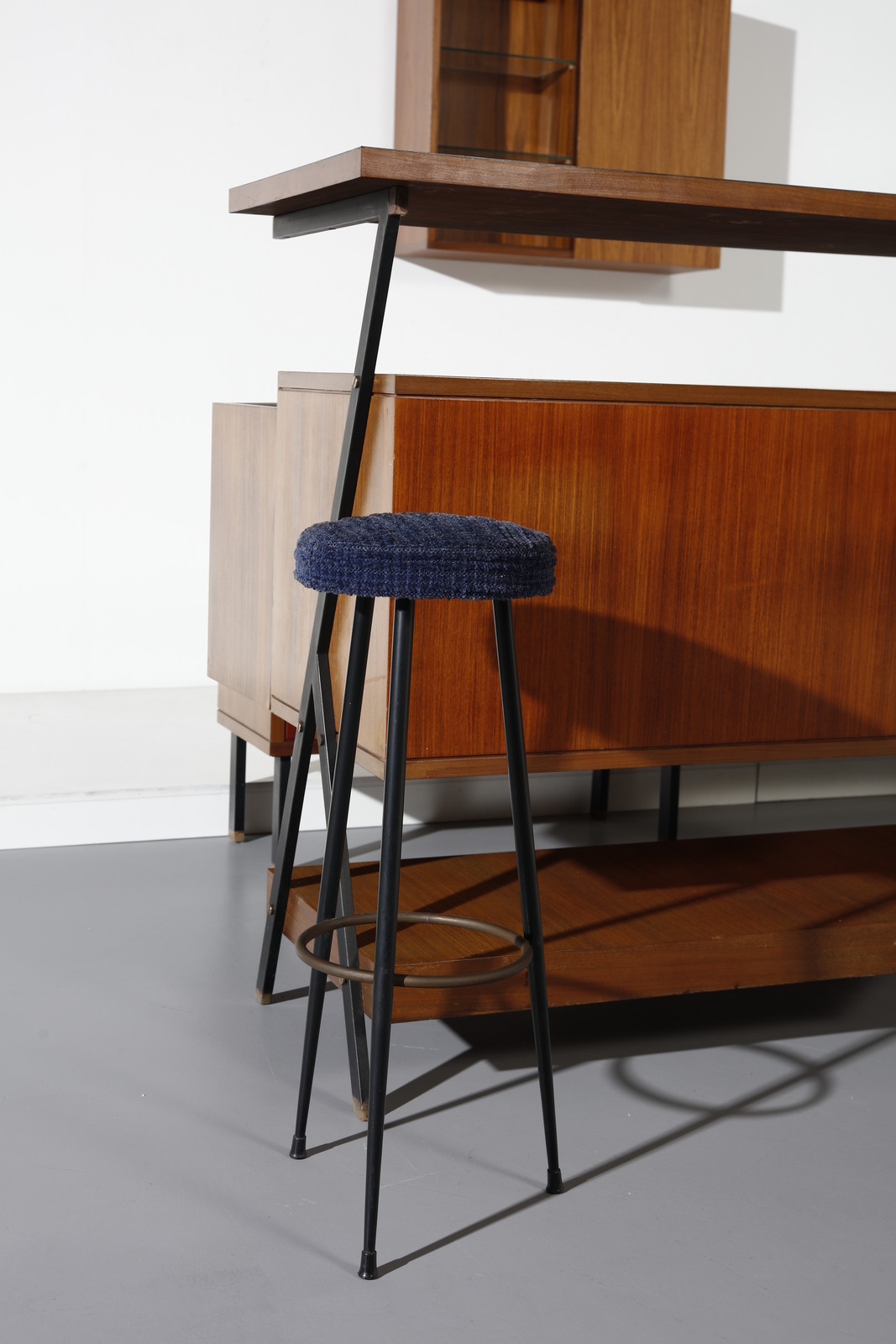 anni Cinquanta..Piano bar: 111 x 142 x 53 cmCredenza: 82 x 232 x 201 cmSgabelli: 72 x 27 cmMobile a parete: 73 x 72 x 27 cmProfondità angolo: 145 cm