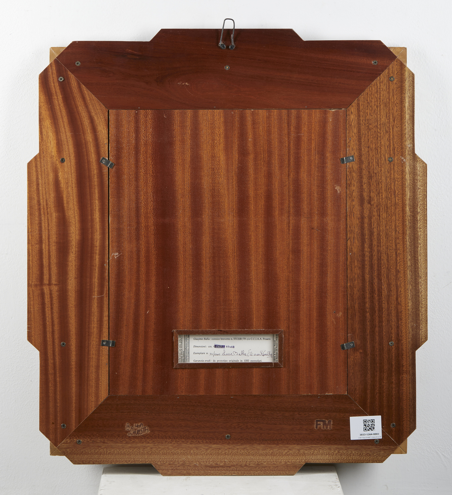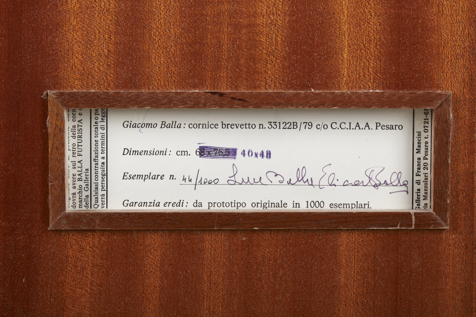 44/1000. Al retro marchio Balla Futurista e Certificato di Garanzia da prototipo originale, cornice brevetto n. 33122B/79 c/o C.C.I.A.A.A. Pesaro. con firma di Lucia e Elicia BallaDimensione specchio: 48x40 cm.