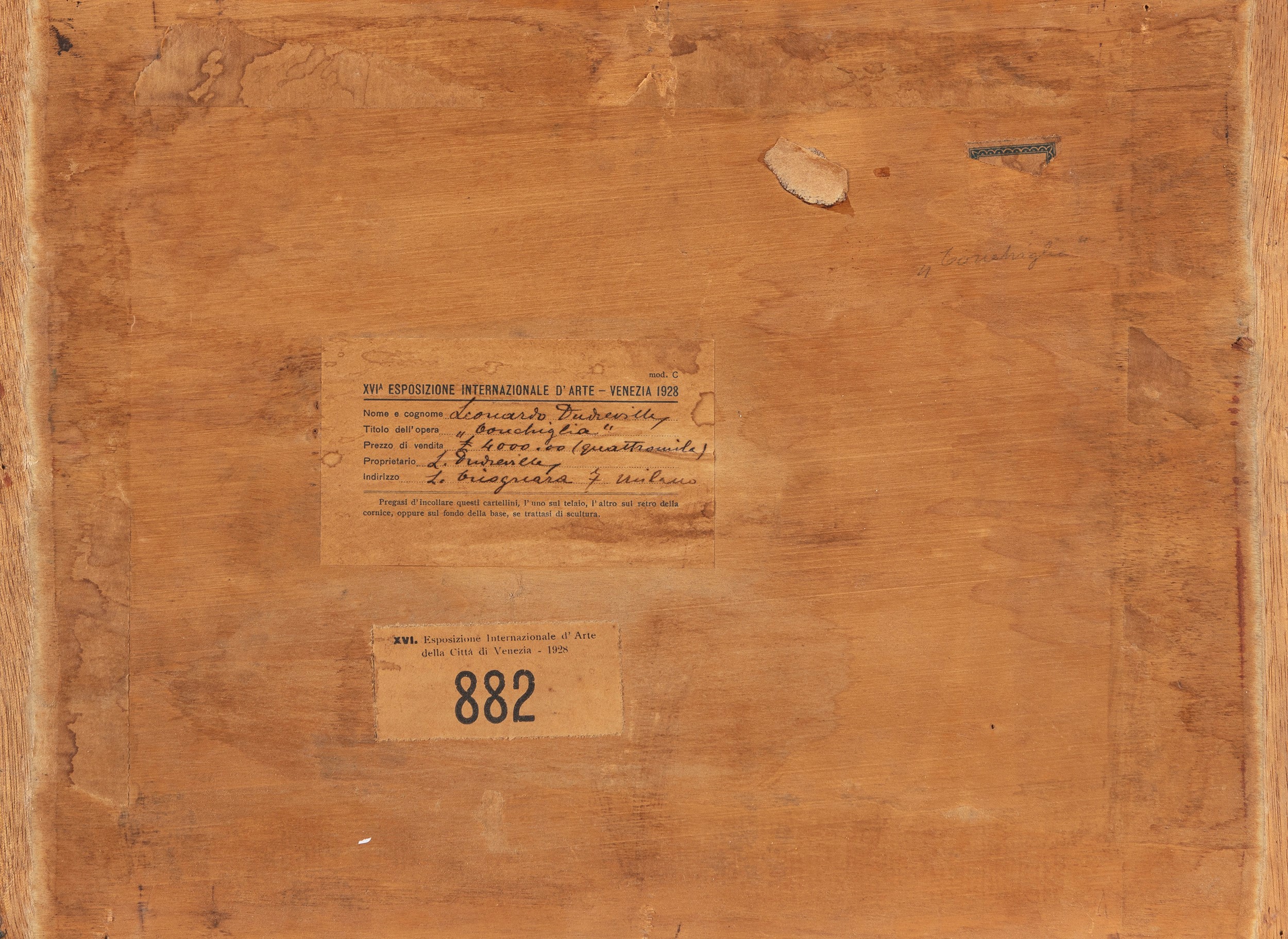 Sul retro etichetta della XVI Esposizione Internazionale d'Arte Venezia, 1928, n. 882 con firma e titolo; titolato dall'artista.