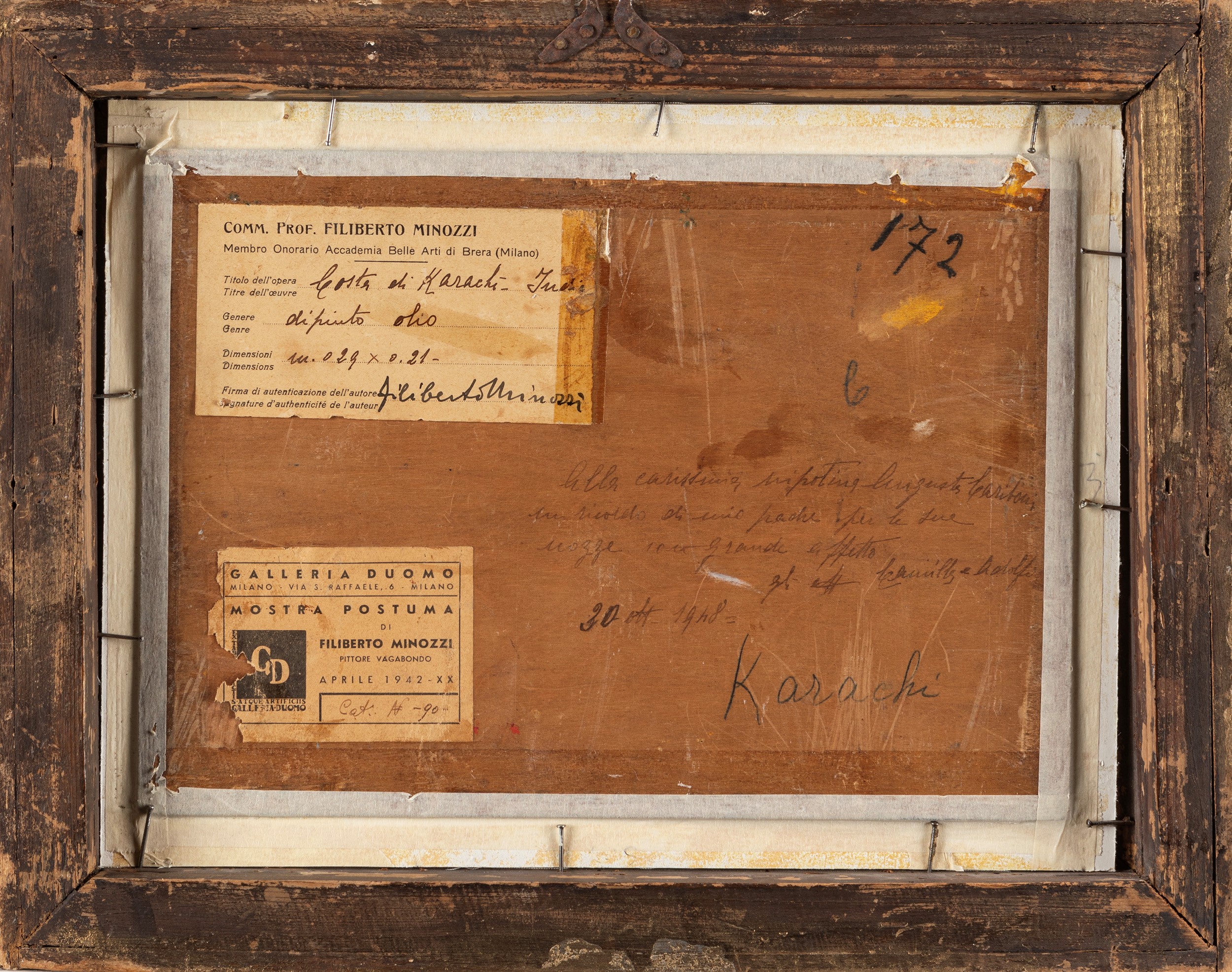 Sul retro, sul supporto, etichetta del pittore con titolo e firma ed etichetta della mostra postuma: Filiberto Minozzi, pittore vagabondo, Galleria Duomo, Milano, aprile 1942, n. 90; sempre sul retro dedica: Alla carissima nipotina Auguste (...) / in ricordo di mio padre per le sue / nozze con grande affetto / gli (...) e Adolfo / 30 ott 1948