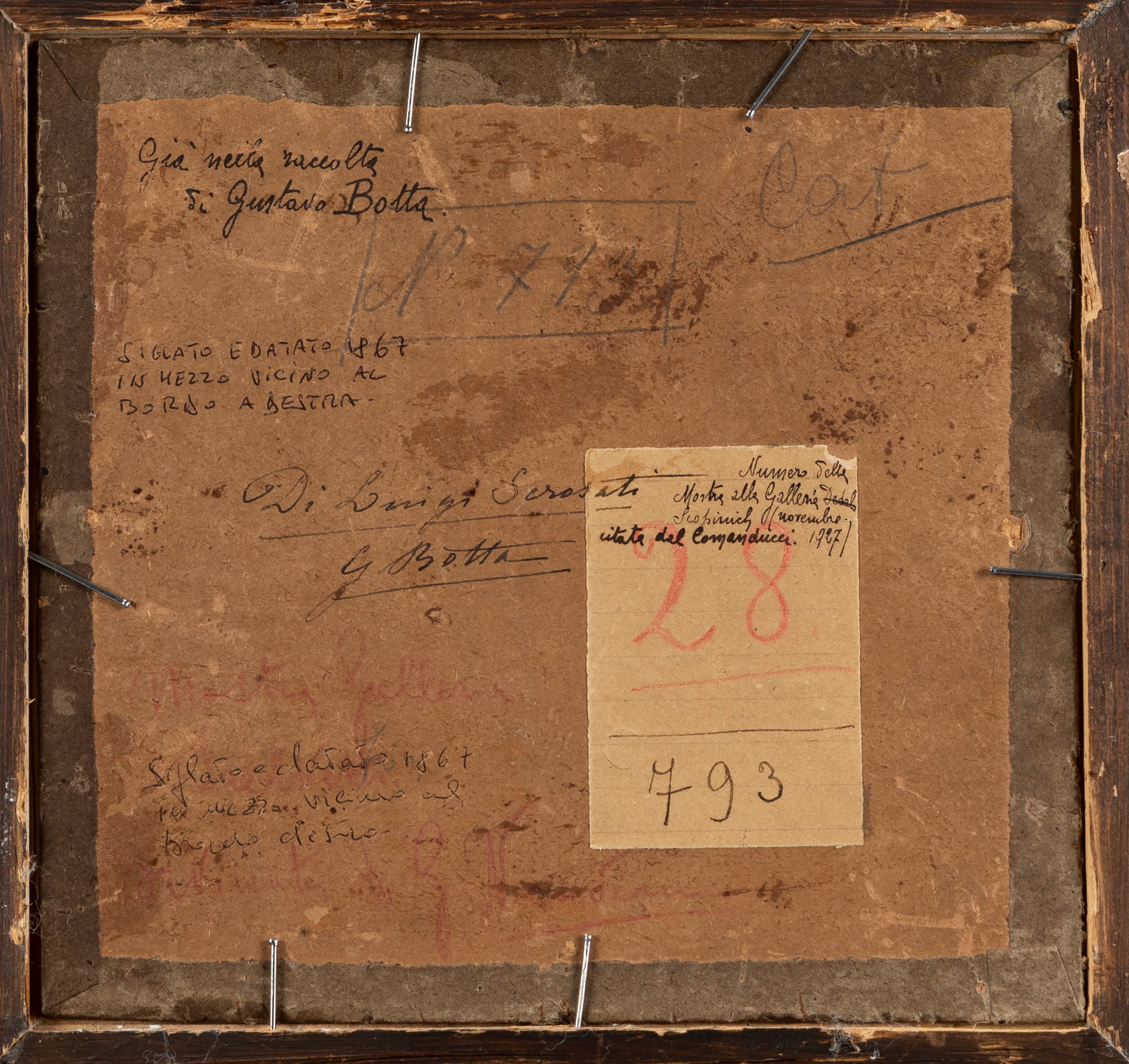 Sul retro etichetta della Mostra monografica alla Galleria Scopinich (novembre 1927) e iscrizione di provenienza: Già nella raccolta / di Gustavo Botta