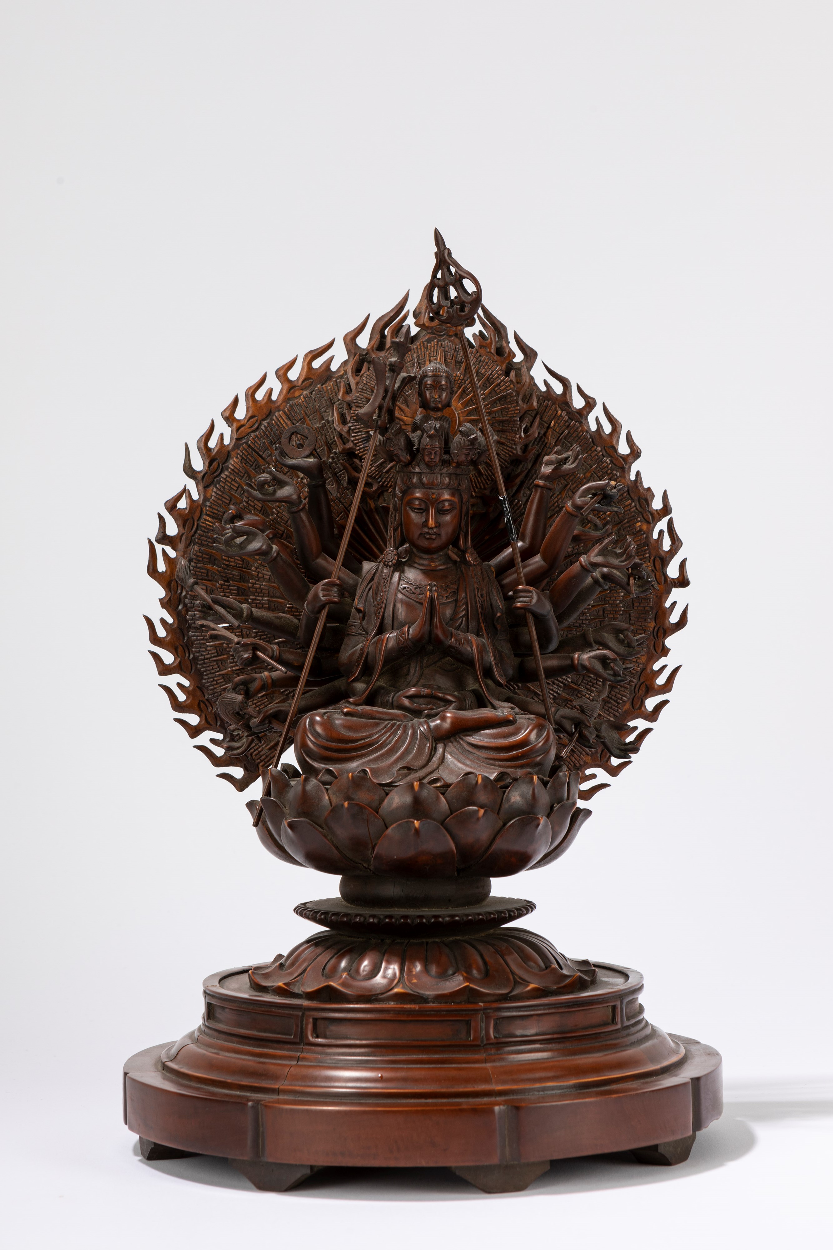 in legno finemente intagliato, assisa su base sagomata a fiore di loto