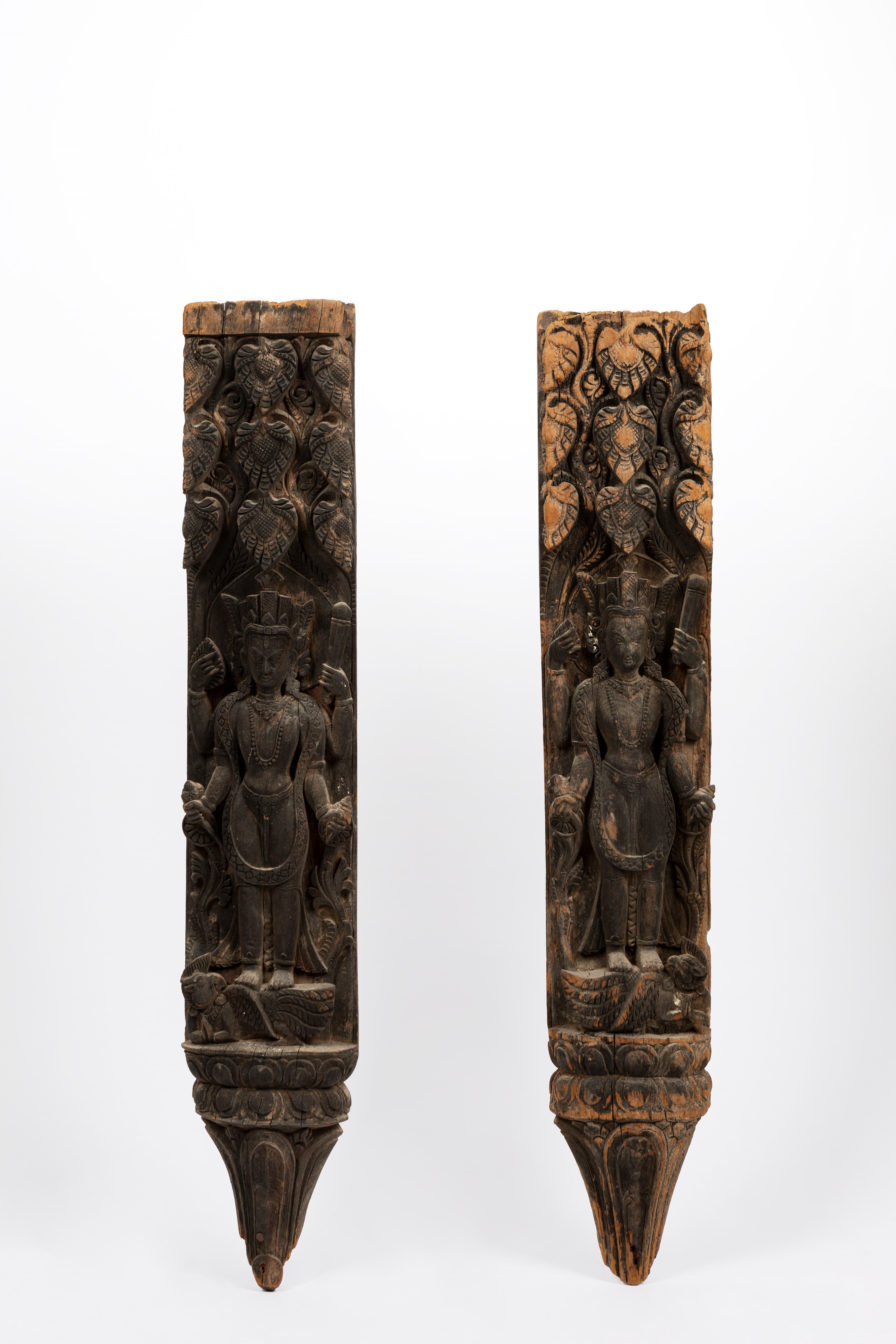 Coppia di lesene in legno raffiguranti divinità . India, inizio secolo XX