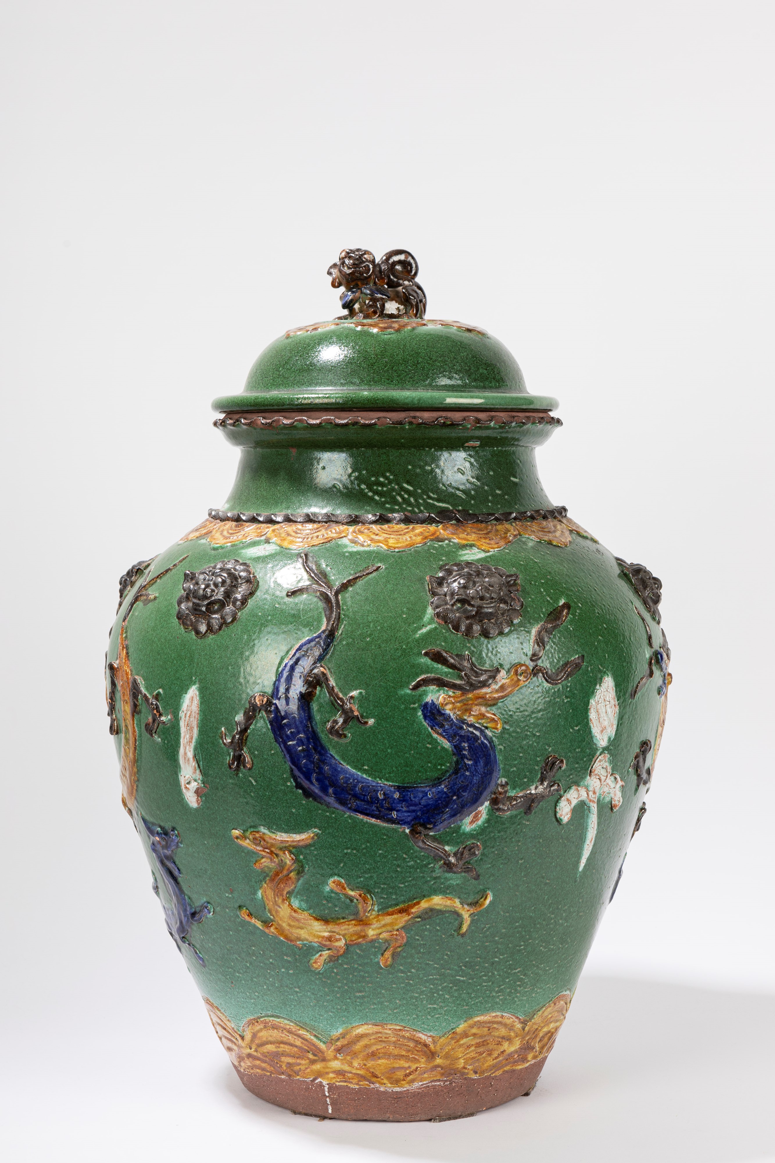 decorata a rilievo con draghi, mascheroni e cane di pho sul coperchio