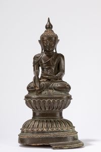 h cm 35 assiso su una base a doppio fiore di loto in posizione di bhumisparsha (difetti alla base)