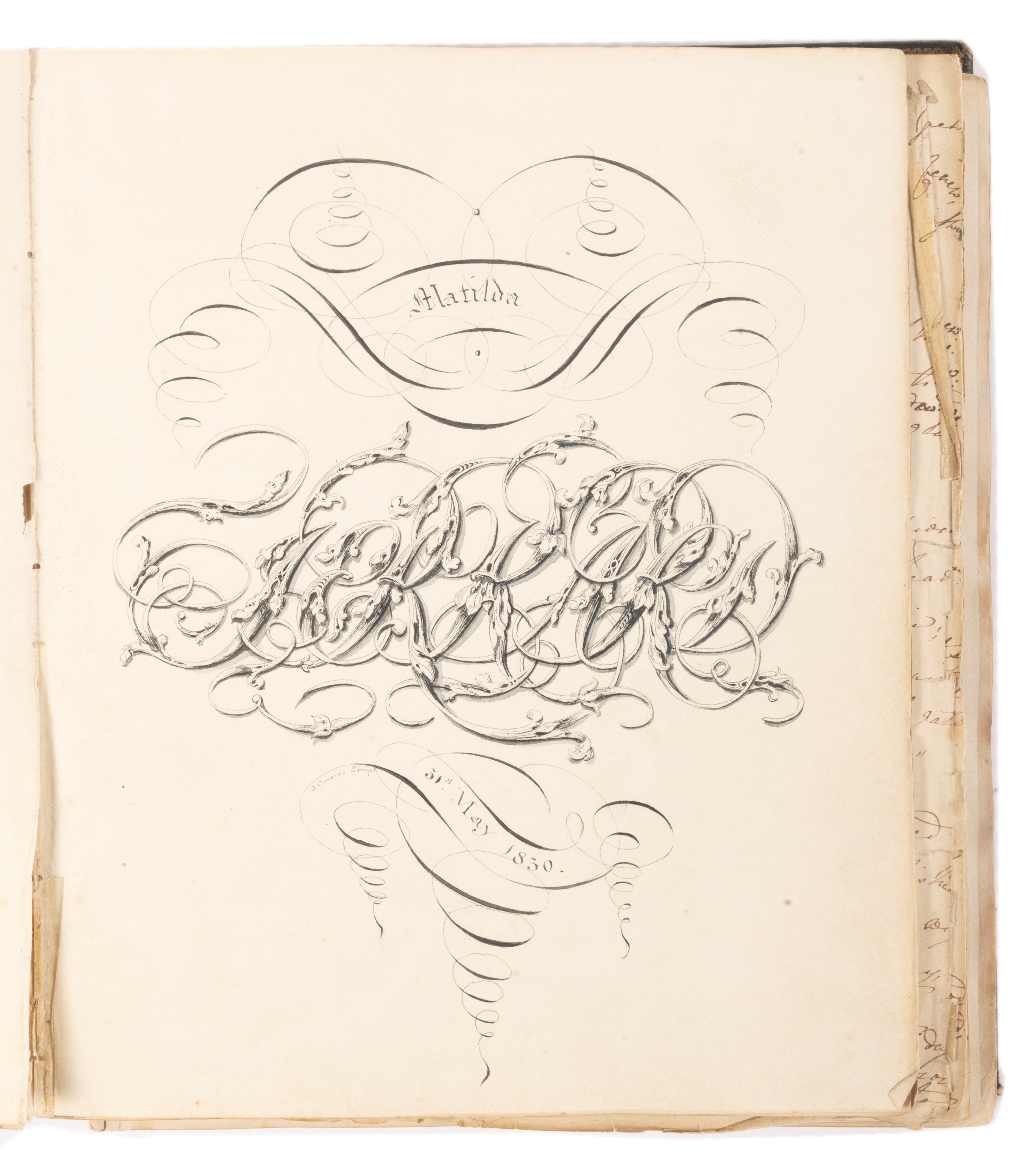 1830 Manoscritto cartaceo composto da un'unica mano in inglese, datato 31 maggio 1830, di circa 70 pagine, 235 x 200 mm., legato in marocchino verde a grana lunga con decorazioni in oro ai piatti e al dorso, sciupata. Insieme nel lotto un quaderno di esercizi di varie materie di Marguerite Ruffo Scilla, datato 1872 [si tratterà probabilmente di Eleonora Margherita Maria Luigia Ruffo di Calabria Santapau Ruffo di Calabria, Principessa di Scilla, Duchessa di Santa Cristina (1861-1954)].