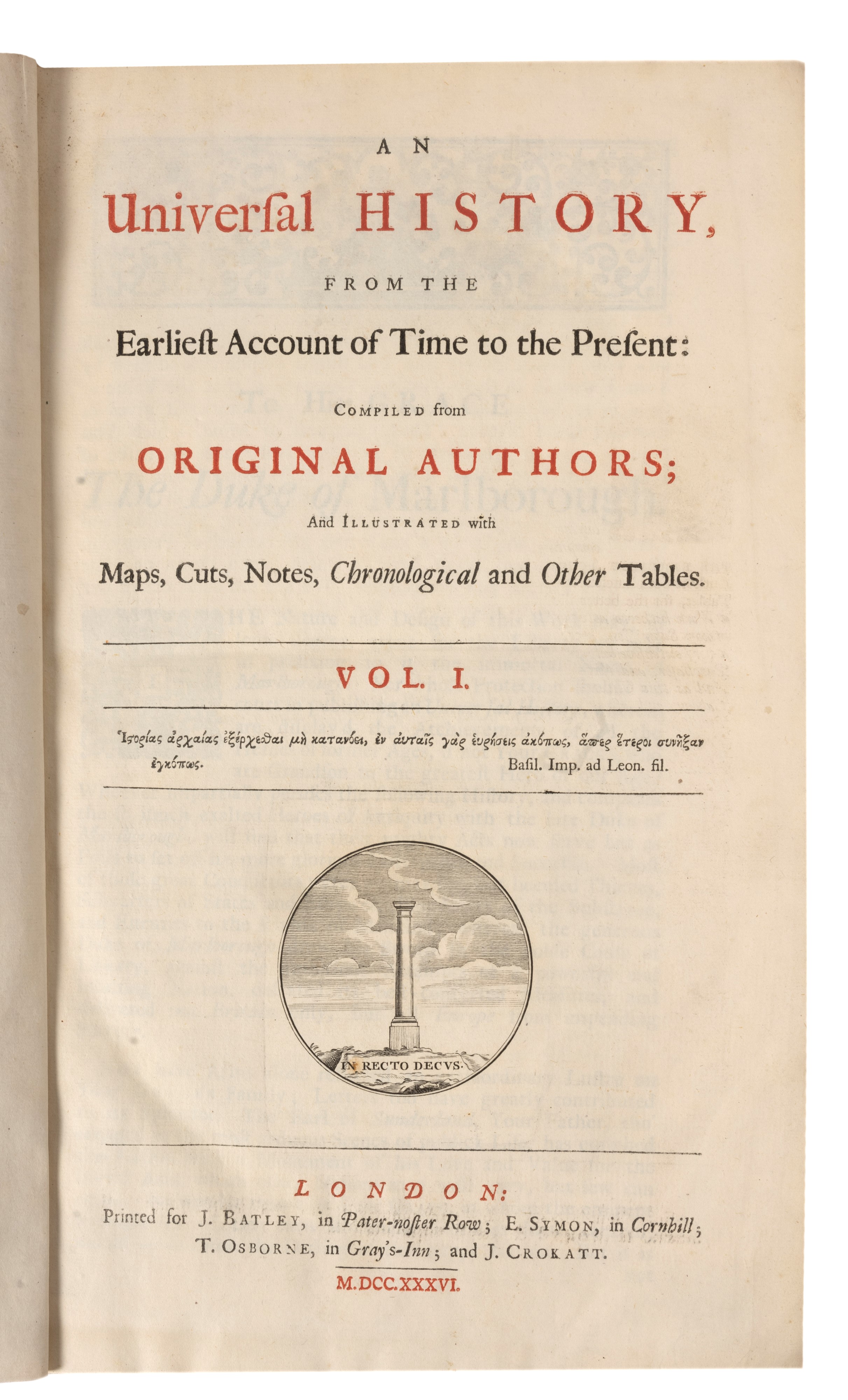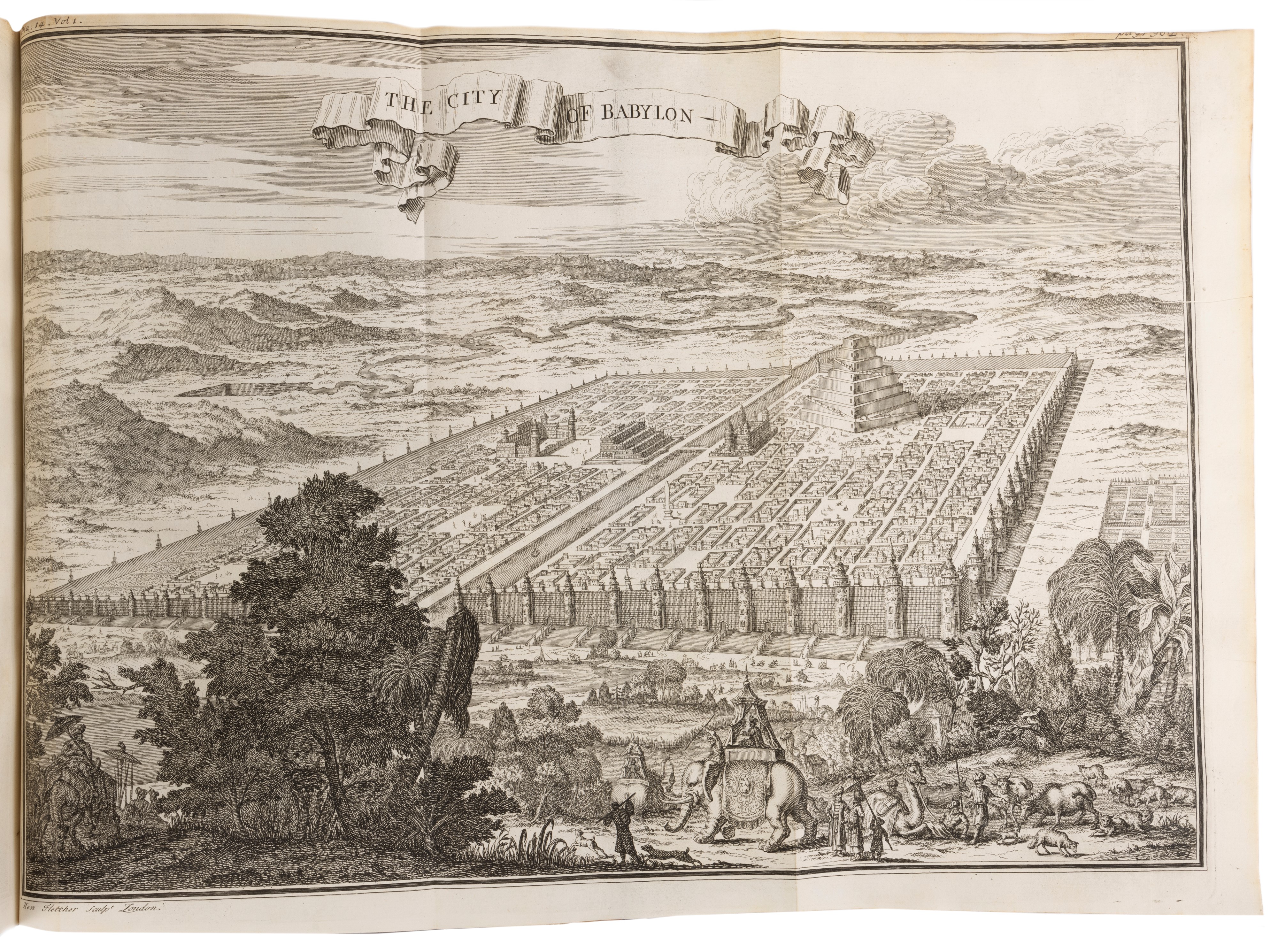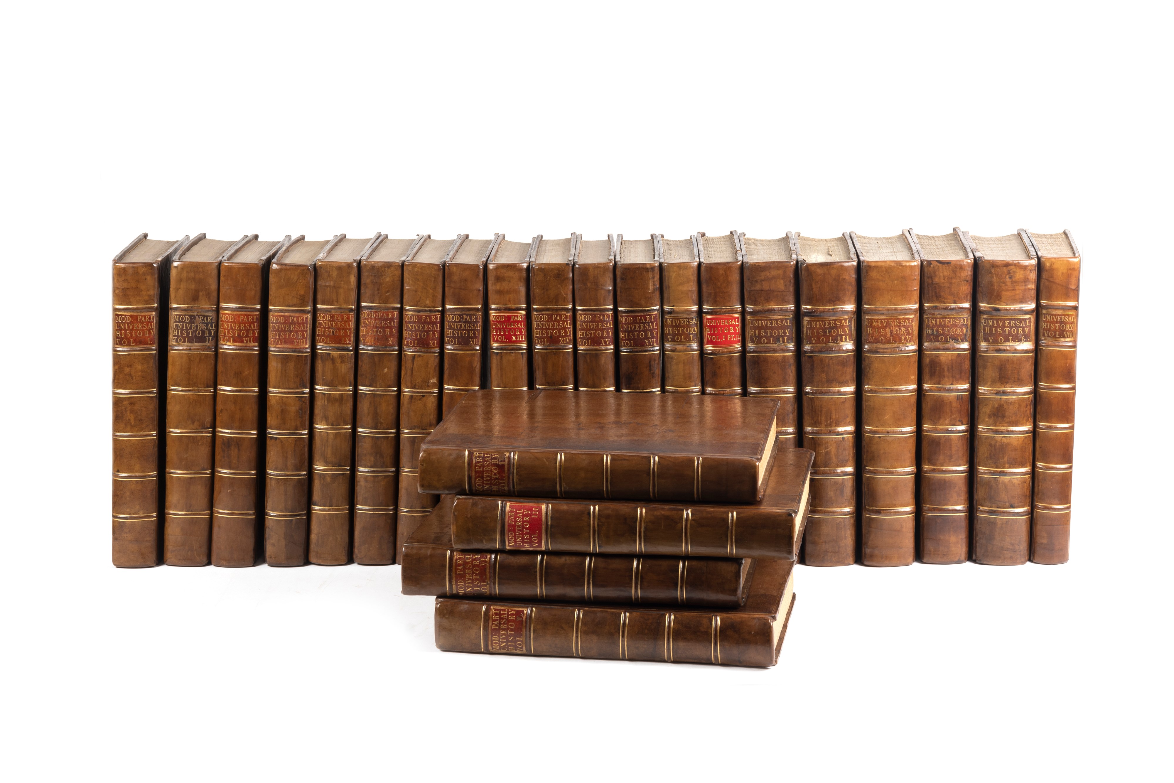 1736 London, J. Batley - Symon - T. Osborne and J.Crokatt, 1736-'44. In 2°, 350 x 222 mm.. 24 voll., inclusi i volumi intitolati The Modern Part, numerosissime tavole, mappe, piante fuori testo, molte delle quali ripiegate, lievi bruniture, legatura coeva in vitello bruno con cornice dorata ai piatti, dorso a sei nervi, titolo su tassello rosso al dorso, tagli a spruzzo rossi. Ex libris al contropiatto di Admiral Wells.