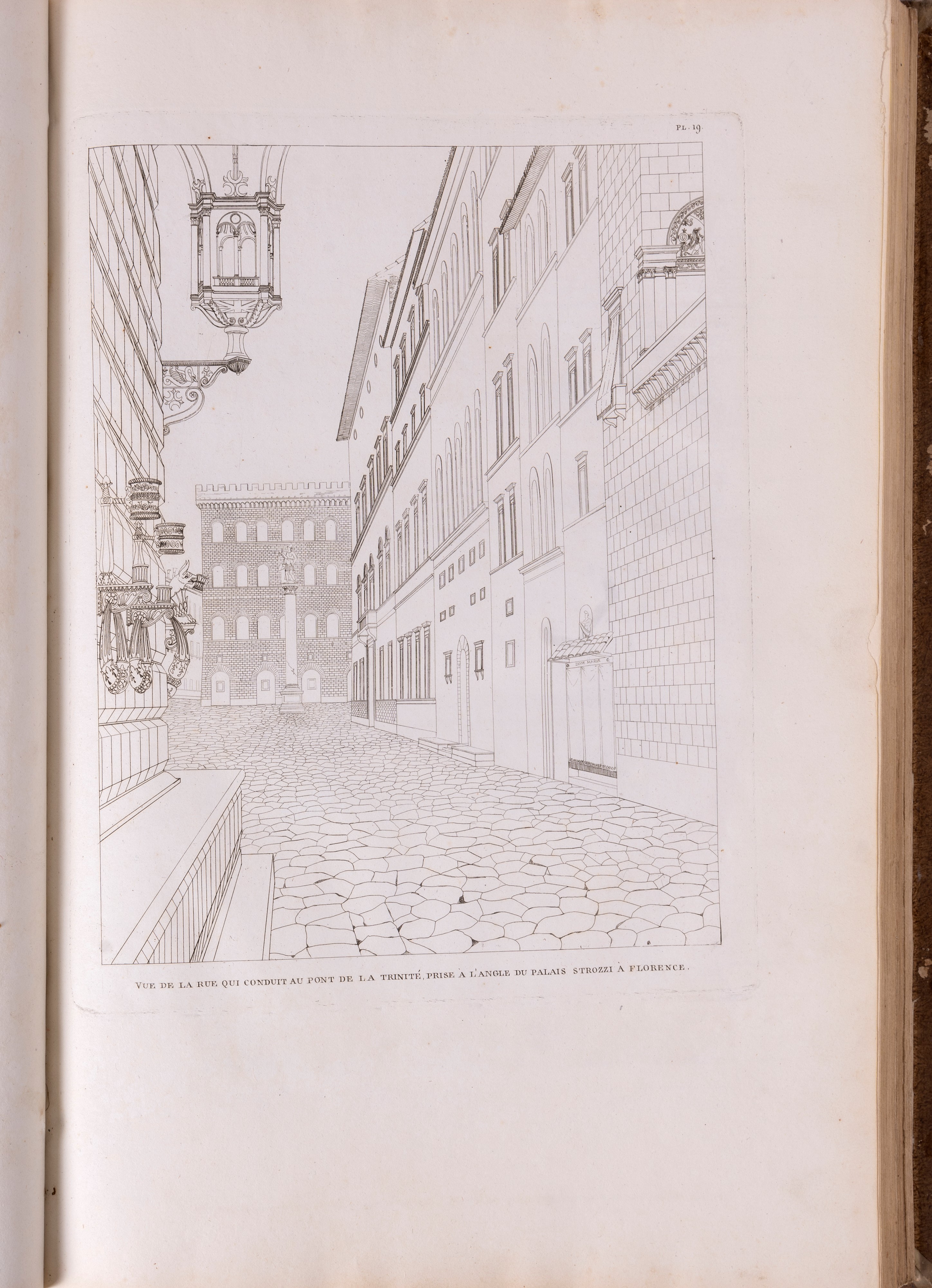 1815 Paris, Pierre Didot l'aîné, 1815. In 2°. 450 x 300 mm.Seconda edizione, in gran parte originale, di quest'opera sull'architettura toscana realizzata da due ex-residenti dell'Accademia di Francia a Roma. L'opera comprende un frontespizio e 109 tavole incise al tratto. Questa edizione è arricchita da 36 nuove tavole, che corrispondono agli ultimi sei numeri pubblicati dal solo Grandjean de Montigny, poiché Famin si era ritirato dall'impresa. Legatura coeva in mezza pelle e cartone, sciupata.