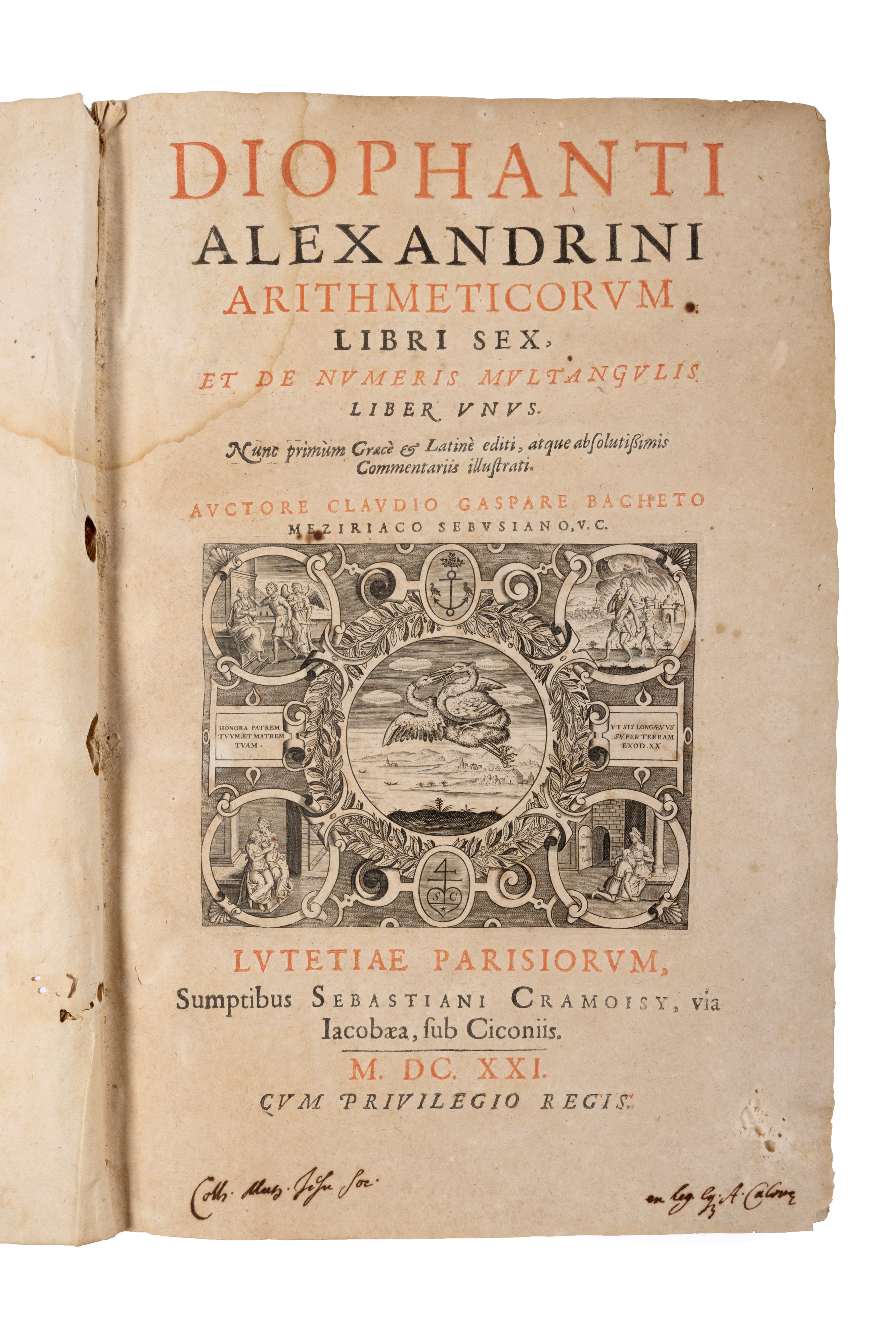 1621 Parigi, H. Drouart, 1621. In 2°. Frontespizio in rosso e nero, testo in greco e latino, diagrammi e formule matematiche nel testo, diffuse bruniture, strappo all'angolo superiore di c.Aa3 (p.281), altro strappetto al centro del margine inferiore di p.285, legatura coeva in pergamena rigida, rovinata. Nota di possesso manoscritta al frontespizio; ex libris al contropiatto di Andrea Molza.