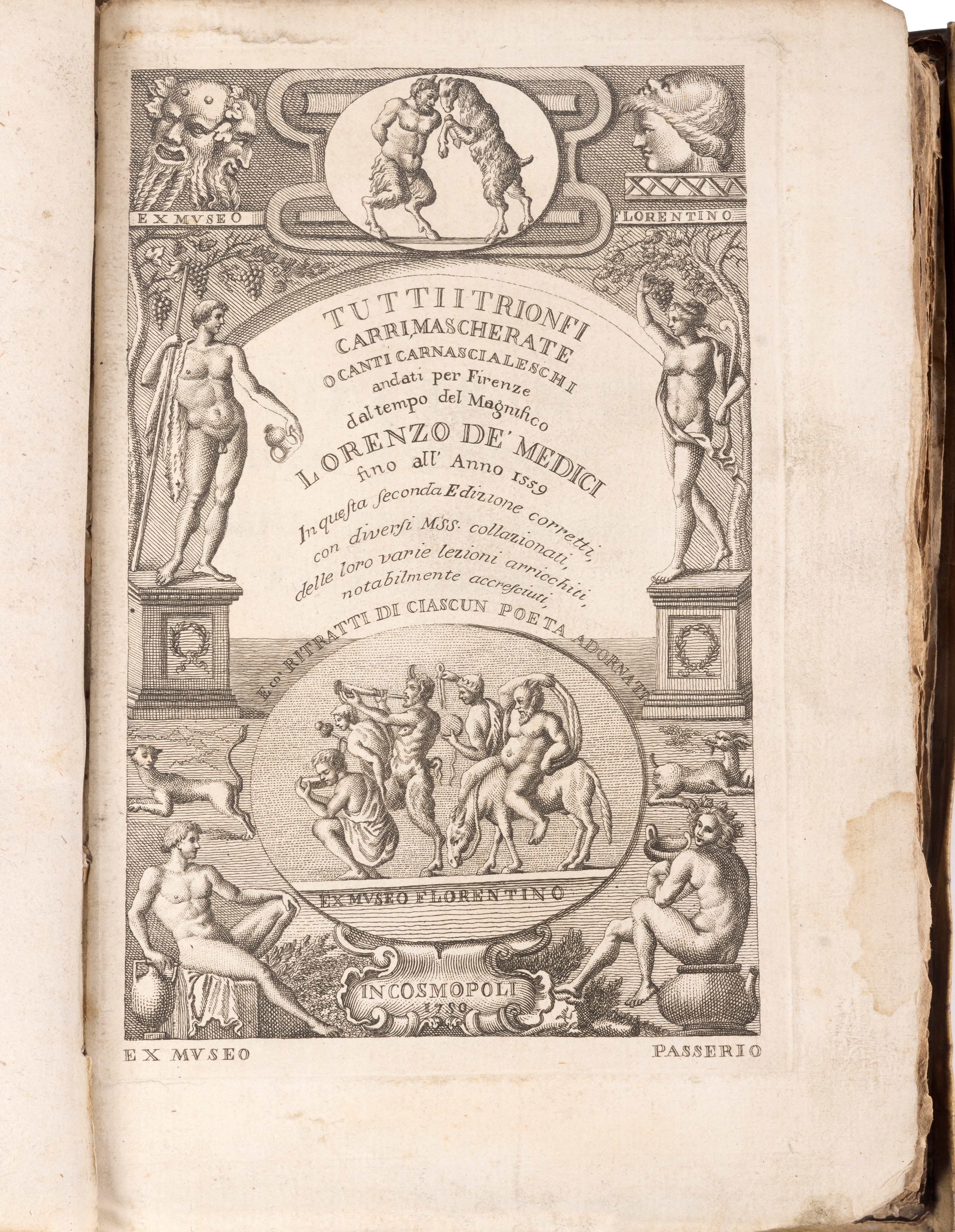 1685 Firenze, Piero Matini, 1685. In 4°. Frontespizio in rosso e nero con frullone cruscante, iniziali e fregi xilografici, il ritratto dell'autore è assente come di consueto, pergamena rigida coeva, tagli a spruzzo rossi. Ex libris al contropiatto di Lodovico Passarini e Thomas Barrett. Nel lotto anche l'edizione di Tutti i trionfi, carri, mascherate...del tempo del Magnifico Lorenzo de' Medici, stampato In Cosmopoli 1750 [ma Lucca, Benedini], in due voll. e un'edizione delle Poesie del Filicaia stampate a Firenze nel 1707.