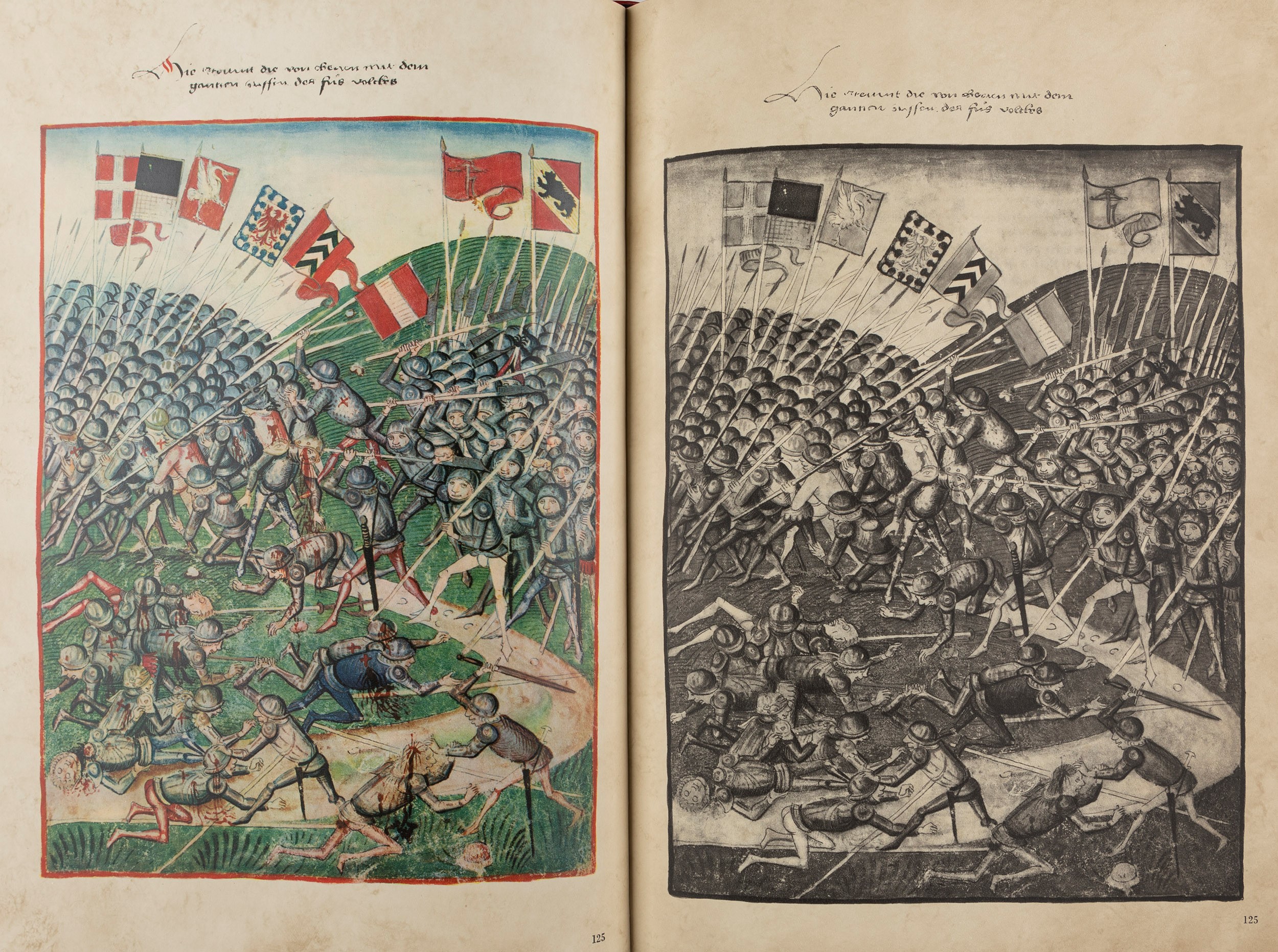 Bern, Aare Verlag, 1943-1945. 4 volumi, 405 x 280 mm. Facsimile completo a colori e monocromatico, legatura in pelle di maiale marrone chiaro, i piatti superiori con lo stemma di Berna in marocchino dorato e colorato, dorso a 5 scomparti, intitolato in oro e con simile scudo araldico coronato. Esemplare 381/400.