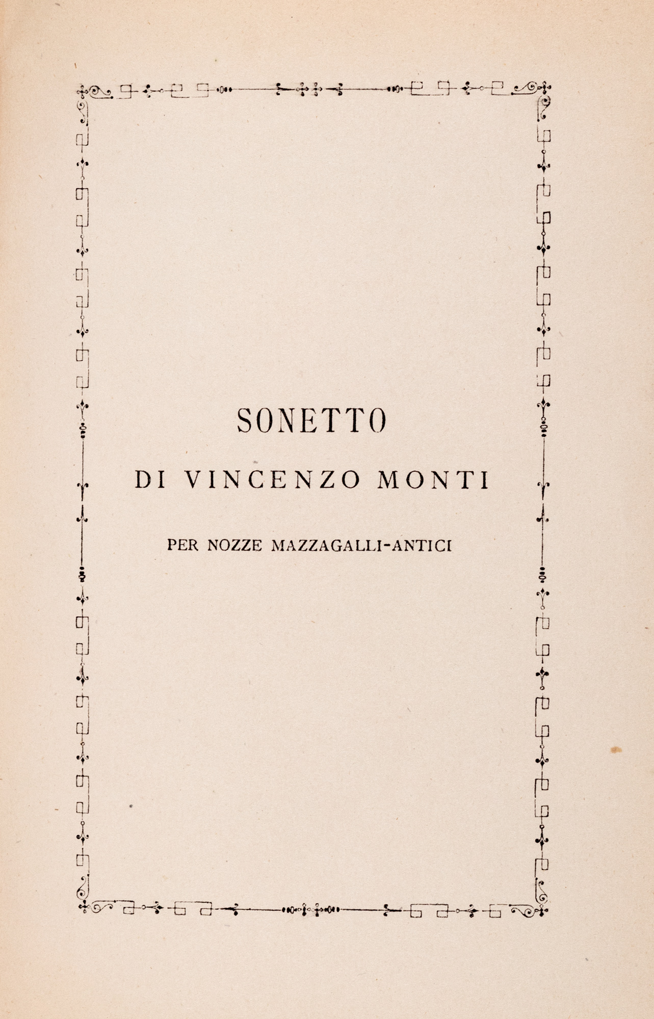 1802 Milano, dalla tipografia nazionale di Luigi Veladini, s.a. [1802 ca.]. In 8°. Cartone rustico coevo. § Odi di Savioli, Lamberti, e Monti in occasione della Festa Nazionale celebrata in Milano nel giorno 26 giugno 1803. In 8°. Marginali arrossature, cartonato moderno. § La Ierogamia. Parigi, dai torchi di P.Didot il maggiore, 1810. In 8°. Copertina originale in carta blu. Insieme nel lotto una placchetta dal titolo Un sonetto sconosciuto di Vincenzo Monti per nozze in Recanati nel 1797. § Insieme nel lotto dello stesso autore Prolusione agli studi dell'Università di Pavia per l'anno 1804. Milano, Francesco Sonzogno, 1804. In 8°. Esemplare a pieni margini, copertina moderna in carta colorata, in astuccio. § Due errata corrige sopra un testo classico del buon secolo della lingua. Milano, Società Tipografica de' Classici Italiani, 1820. In 4°. Brossura editoriale § La spada di Federico II re di Prussia Ottave. Milano, De Stefanis & Zeno, [1806]. In 4°. Cartonato moderno. § Il ritorno di Astrea. Milano, Regia Stamperia, 1816. In 8°. Copertina in carta decorata. § Un sollievo nella malinconia. Milano, Soc. Tipografica dei Classici Italiani, 1822. In 8°. Esemplare in barbe, copertina editoriale in carta azzurra.