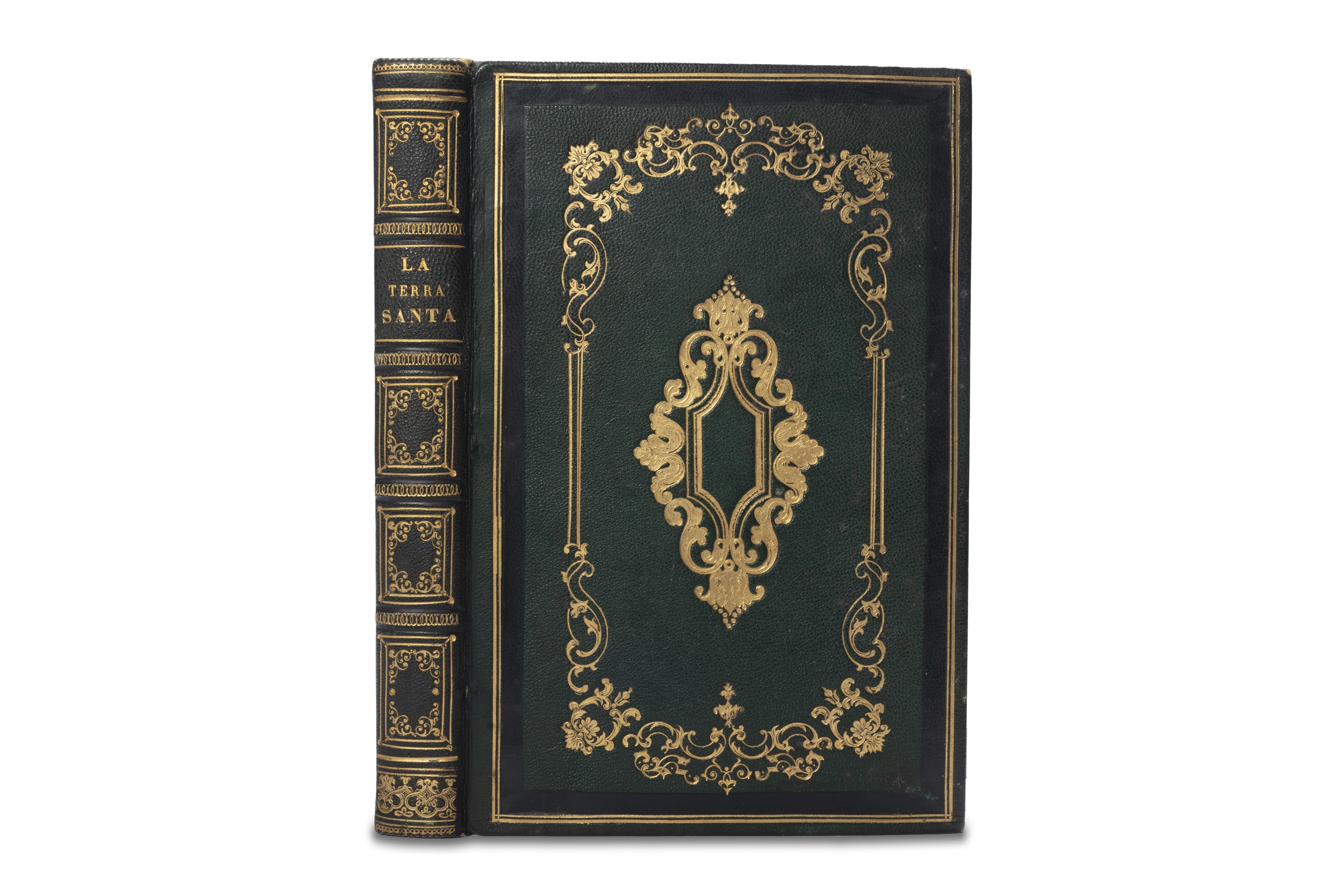 1848 Londra, John Murray, 1848. In 8°. 2 voll. Con incisioni in rame, di cui due ripiegate al I vol. di cui una con strappo senza perdita lungo la piegatura al I vol, due tabelle ripiegate al secondo vol. di cui una con piccolo strappo senza perdita, legatura in mezzo marocchino e carta marmorizzata, titolo e autore entro tasselli rossi al dorso, difetti ai dorsi, segni di usura. § Insieme nel lotto Martorelli, Iginio, La Terra Santa, Vercelli, Degaudenzi, 1854. In 8°. Incisione in rame con una veduta di Gerusalemme in antiporta, una piccola pianta di Gerusalemme, qualche fioritura e piccola macchia, bella legatura coeva in marocchino verde, eleganti fregi in oro ai piatti, titolo impresso in oro al dorso, tagli dorati.