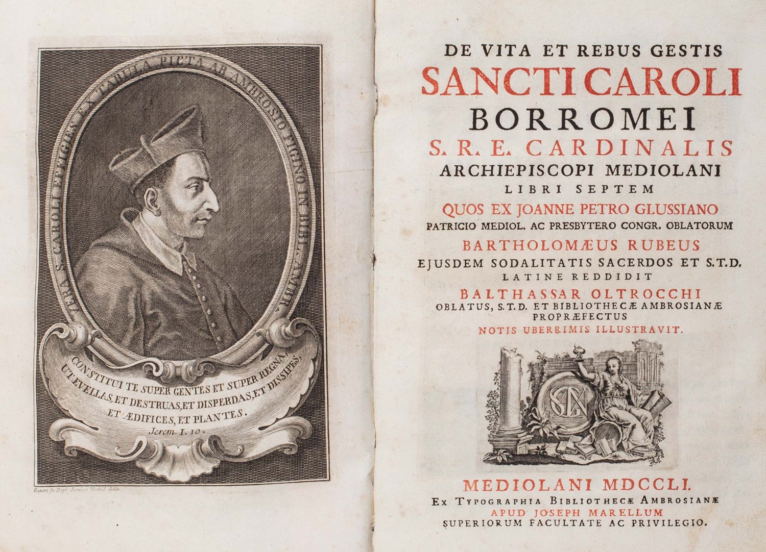 1751 Milano, Stamperia della Biblioteca Ambrosiana, 1751. In 4°. Antiporta con bel ritratto di S. Carlo finemente incisa in rame da G. B. Sassi, titolo a stampa rossa e nera con vignetta incisa, alcune iniziali in rame, altre in silografia, esemplare in barbe, legatura coeva in cartonato.