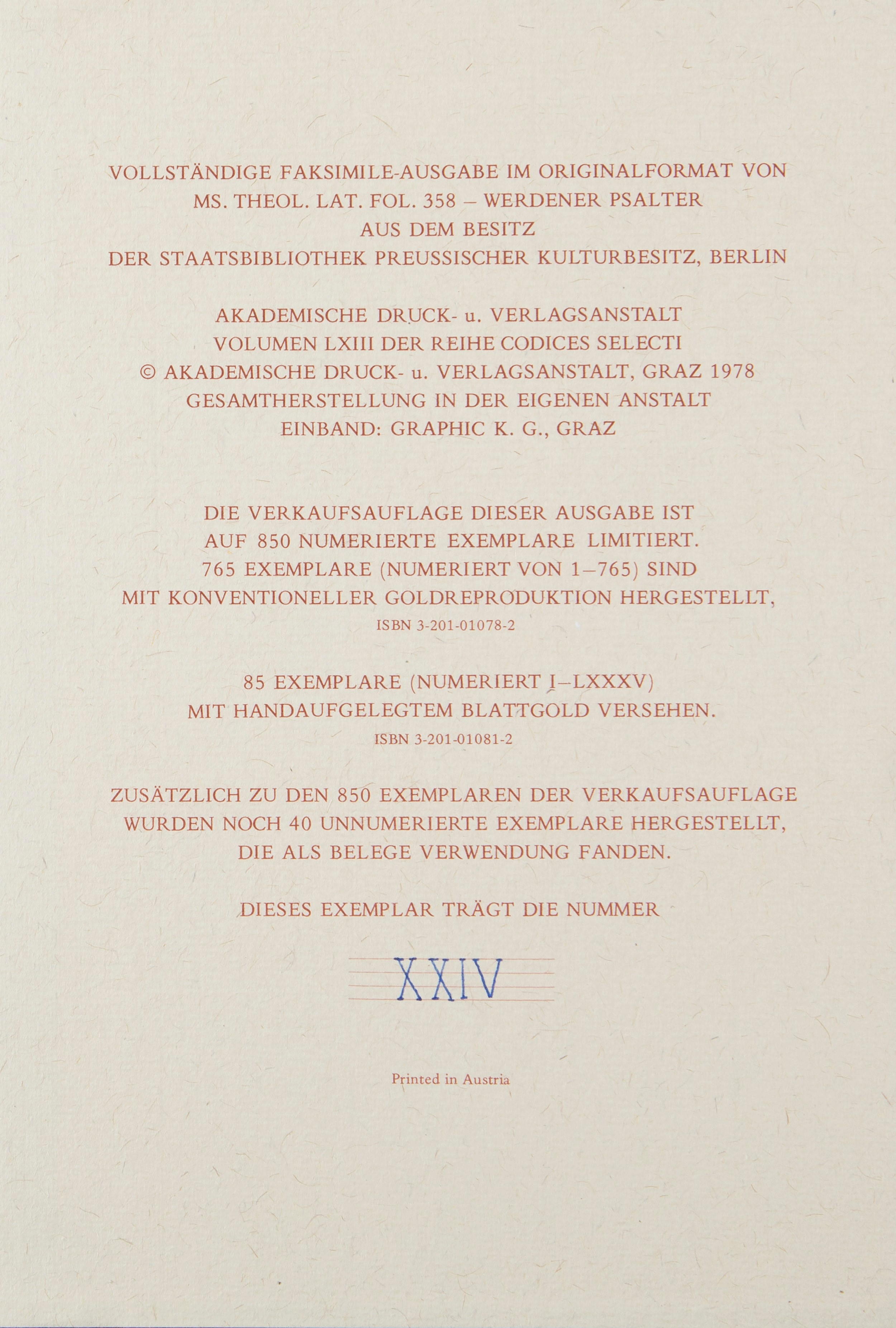 1978 Graz, Akademische Druck Verlagsanstalt, 1978. 255 x 175 mm.  Legatura in pelle con impressioni a secco. Commentario a cura di Hermann Knaus. Esemplare XXIV/85, copia di testa.